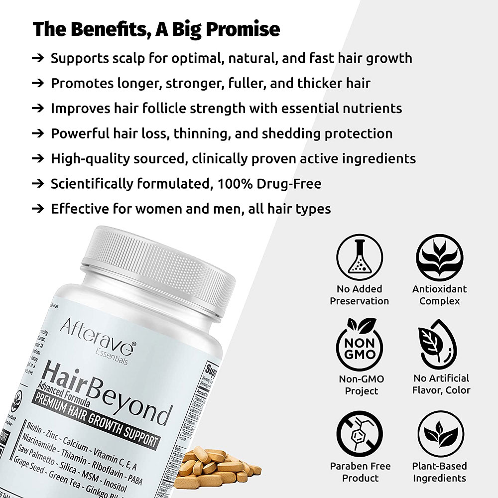 مکمل تقویت موی افترایو هیر بیوند Afterave Hair Beyond دارای فرمول قدرتمند بدست آمده از منابع گیاهی باکیفیت برای تقویت پوست سر سالم به منظور رشد بهینه، طبیعی و سریع مو است و به طور موثر باعث موهایی قوی تر، مستحکم تر، متراکم تر و ضخیم تر می شود. این مکمل استحکام فولیکول مو را با مواد مغذی ضروری بهبود می بخشد و از موها در برابر ریزش، نازک شدن و کنده شدن محافظت می کند.
