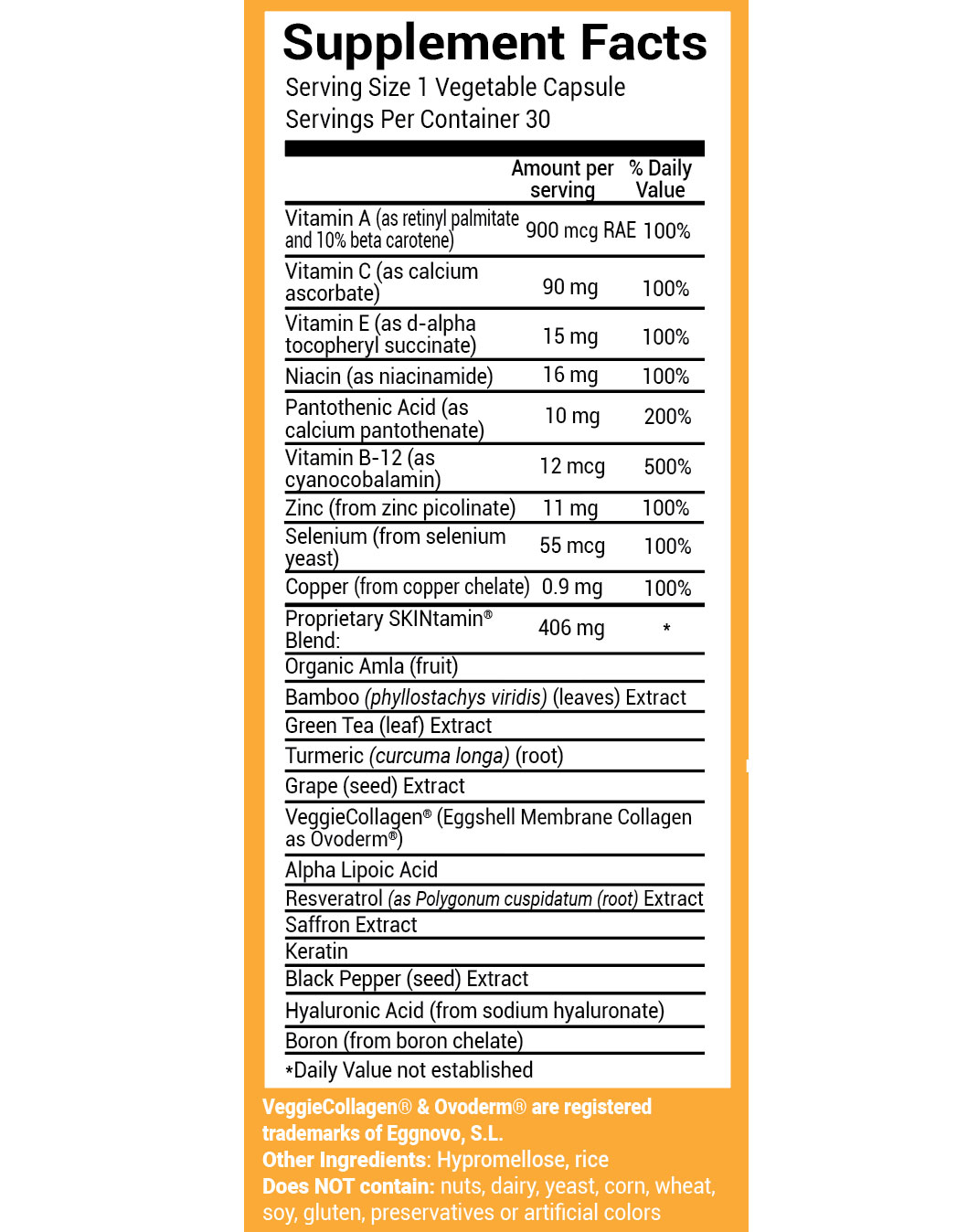 مکمل بهبود سلامت پوست اسکین تامین SkinTamin Collagen حاوی 22 ماده موثر باکیفیت با منشاء طبیعی و ویتامین های ضروری برای حمایت از سلامت پوست از درون می باشد. مکمل اسکین تامین حاوی کلاژن بدست آمده از غشای پوسته تخم مرغ برای افزایش شکل گیری و تولید کلاژن به عنوان عامل اتصال بافت پوست برای ایجاد مش مستحکم تر، کاهش چروک ها و افزایش سفتی و انعطاف پذیری پوست می باشد. اسکین تامین همچنین کاهش دهنده جوش است و به بهبود رنگ پوست و افزایش روشنایی پوست کمک می کند. علاوه بر این هیالورونیک اسید برای آبرسانی پوست، نیاسین آمید برای کاهش لک، جوش و بهبود رنگ پوست و پنتنول (ویتامین B5) برای ترمیم و بازسازی پوست به این ترکیب اضافه شده است.