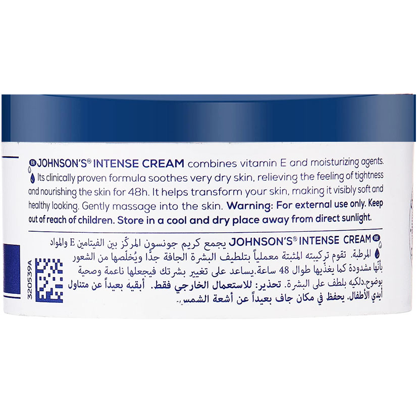 کرم مغذی قوی صورت و بدن جانسون Johnsons Intense دارای فرمول غنی و بافت متراکم برای تغذیه و رطوبت رسانی عمیق پوست های خشک و خیلی خشک به همراه مواد ضروری مورد نیاز برای احیای سلامتی پوست می باشد. کرم اینتنس جانسون حاوی ویتامین E به عنوان آنتی اکسیدان ضدپیری و محافظت کننده پوست و مواد موثر آبرسان است، این فرمول تایید شده کلینیکال برای تسکین پوست های خیلی خشک است و با تغذیه 48 ساعته پوست، احساس تنگی و کشیدگی ناشی از خشکی را از بین می برد و پوستی با نمای سالم، لطیف و آسوده را به ارمغان می آورد.