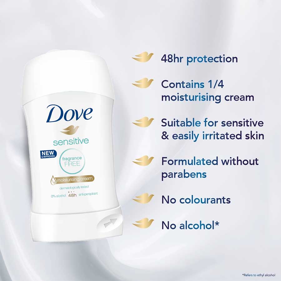 استیک ضدتعریق بدون رایحه داو سنسیتیو Dove Sensitive محافظت کننده 48 ساعته خشکی و تازگی زیر بغل به همراه یک چهارم کرم مرطوب کننده داو برای تغذیه و لطافت پوست می باشد. استیک سنسیتیو داو همچنین دارای فرمول بدون رایحه برای مراقبت ویژه از پوست های حساس است. این عملکرد به همراه فرمول بدون الکل با خاصیت تسکین دهنده و محافظت کننده پوست زیر بغل پس از شیو کردن تکمیل می شود و احساس پوستی تازه، لطیف و محافظت شده را به ارمغان می آورد.
