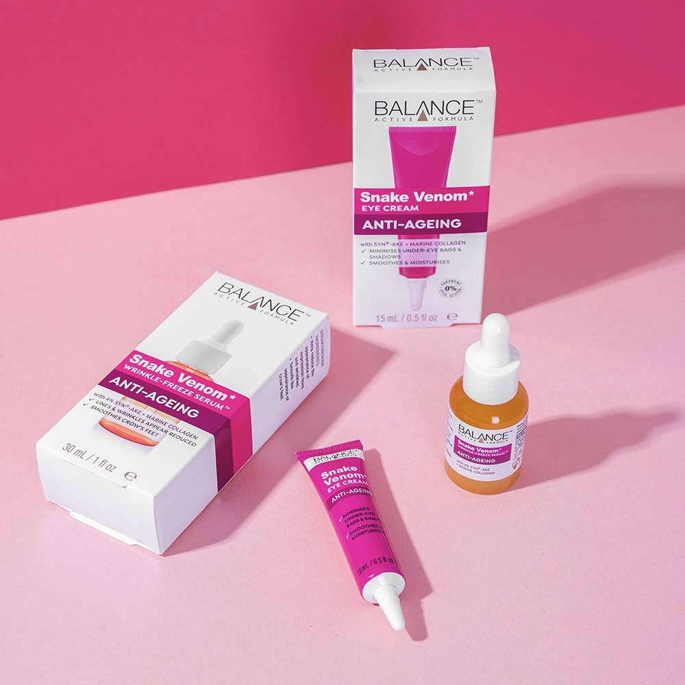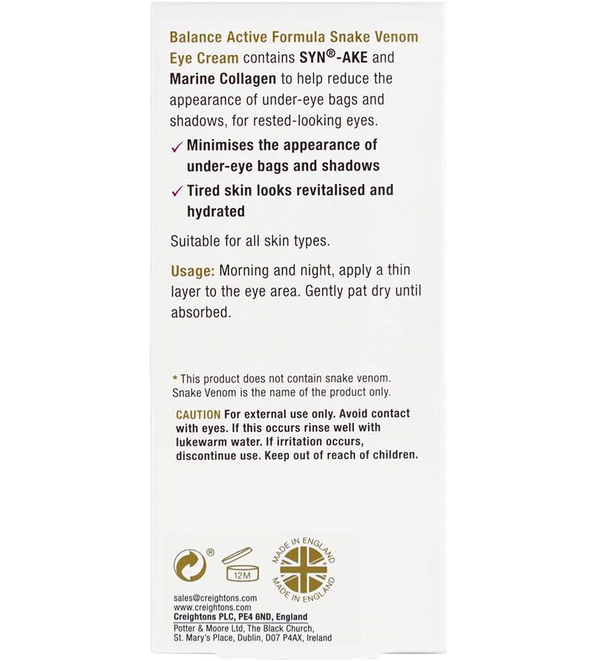 کرم ضد پیری دور چشم بالانس اکتیو فرمولا Balance Snake Venom دارای فرمول ویژه برای کاهش پف و سایه زیر چشم و افزایش سفتی و سطح هموار پوست ناحیه کانتور چشم به همراه آبرسانی و احیای سرزندگی پوست های خسته می باشد. کرم دور چشم اسنیک ونوم بالانس حاوی کمپلکس پپتید اختراعی SYN-AKE است که عملکرد پپتید موجود در سم مار افعی را شبیه سازی می کند و با کاهش فعالیت ماهیچه های درگیر باعث ایجاد پوستی سفت تر و صاف تر و کاهش پوست شل و افتاده زیر چشم که منجر به پف و سایه می شود و کاهش خطوط پنجه کلاغی کنار چشم می شود. این فرمول علاوه بر این حاوی کلاژن دریایی برای تسریع بخشی فرایند ساخت کلاژن پوست می باشد و نمای جوان تر پوست را به ارمغان می آورد.