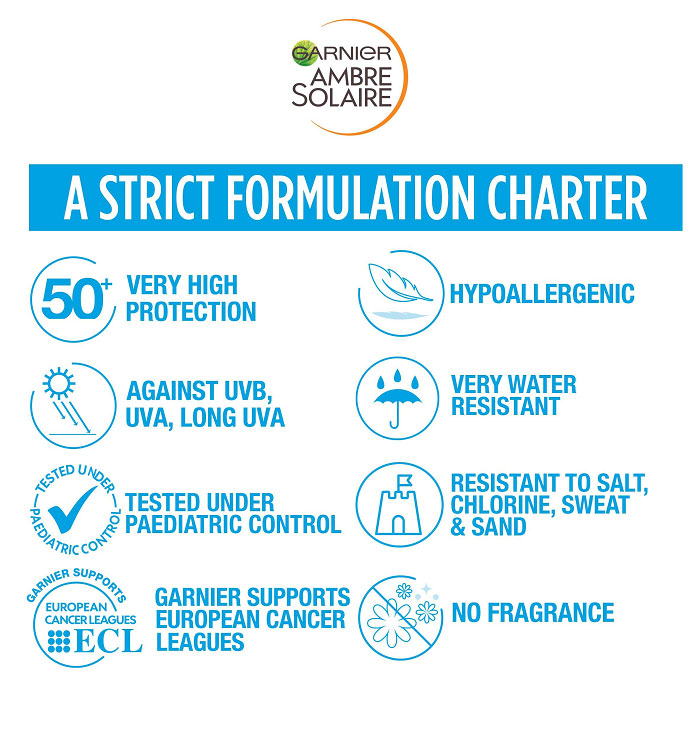 لوسیون ضدآفتاب کودک گارنیه Garnier Ambre Solaire SPF50 Kids دارای فرمول طراحی شده تحت نظارت متخصصین کودک و با محافظت کنندگی فوری در برابر پرتوهای UVA و UVB و مناسب برای کودکان است. لوسیون ضدآفتاب گارنیه دارای بافت لطیف و غیرآلرژی زا برای مراقبت ویژه از پوست حساس کودک است و دارای فناوری NETLOCK برای محافظت نهایی و مقاومت قدرتمند در بافت نامرئی ضدآفتاب می باشد. این فرمول مقاوم در برابر آب، تعریق، نمک و ماسه است و هماهنگ با استانداردهای اروپا و تایید شده توسط بنیاد پوست بریتانیا می باشد.