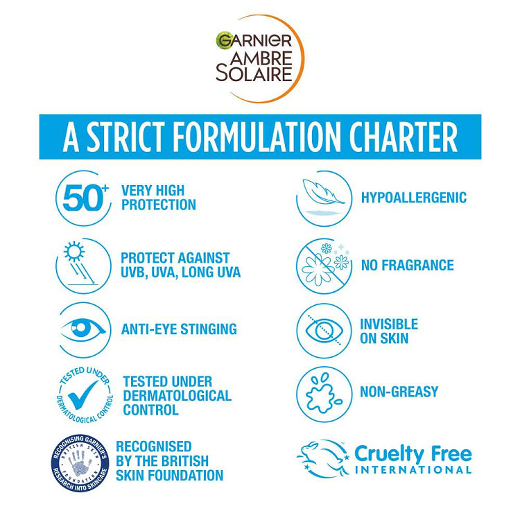 فلویید ضدآفتاب و ضد لک گارنیه Garnier Ambre Solaire Super UV SPF50 دارای فرمول محافظت کننده قوی در برابر پرتوهای UVA، UVB و Long UVA و جلوگیری کننده از ایجاد لک ناشی از آفتاب به همراه مراقبت پوست در برابر آلودگی محیطی می باشد. فلویید ضدآفتاب گارنیه دارای بافت سبک و حاوی هیالورونیک اسید برای آبرسانی روزانه پوست و ویتامین E به عنوان آنتی اکسیدان محافظت کننده و ضد پیری پوست است. این ترکیب همچنین دارای فناوری NETLOCK برای محافظت نهایی و مقاومت قدرتمند در بافت نامرئی ضدآفتاب است و هماهنگ با استانداردهای اروپا و تایید شده توسط بنیاد پوست بریتانیا می باشد.