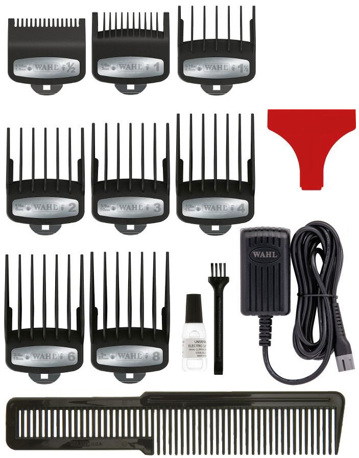 اقلام همراه ماشین اصلاح شامل هشت عدد شانه تقویت شده با فلز برای استحکام بیشتر با سایز اصلاح 0.5 میلی متر، 3 میلی متر و 4.5 میلی متر، 6 میلی متر، 10 میلی متر، 13 میلی متر، 19 میلی متر و 25 میلی متر، یک عدد شانه مو، یک عدد روغن روانکاری، یک محافظ تیغه، یک برس تمیزکاری و یک عدد شارژر می باشد.