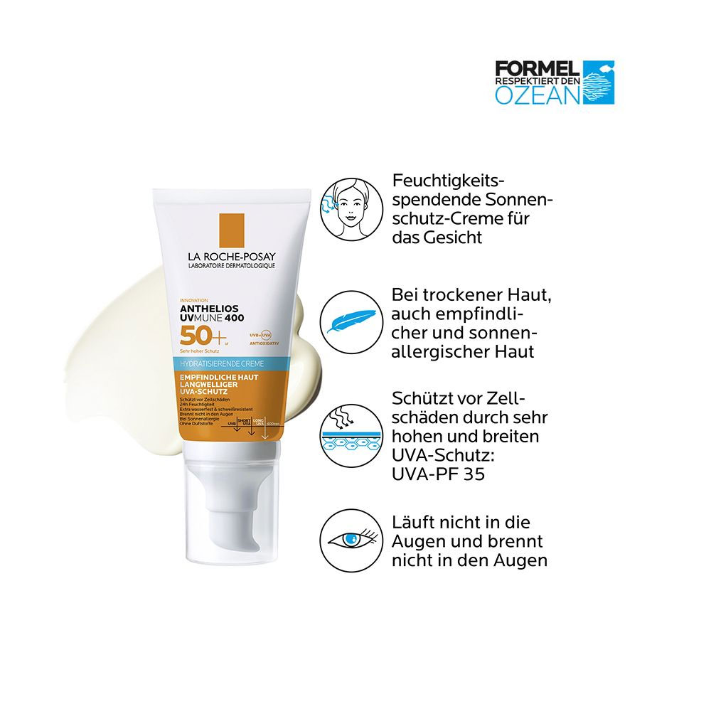 کرم ضدآفتاب و آبرسان لاروش پوزای LaRoche Posay SPF50 Hydratante دارای فناوری MEXORYL400 برای محافظت در برابر پرتوهای UVA با طول موج بالاتر از 400 نانومتر که باعث آسیب دیدگی عمیق سلولی می شود، است. این فرمول همچنین حاوی مواد موثر آبرسان 24 ساعته برای حفظ شادابی پوست در طول روز و فناوری NETLOCK برای محافظت نهایی و مقاومت قدرتمند در بافت نامرئی ضدآفتاب است. ضدآفتاب لاروش پوزای توسط بیش از 60000 متخصص پوست در سراسر جهان توصیه شده، مقاوم در برابر آب و ماسه است، چشم را نمی سوزاند و توسط فرمول بدون رایحه برای انواع پوست از جمله پوست های حساس و واکنش پذیر مناسب می باشد.