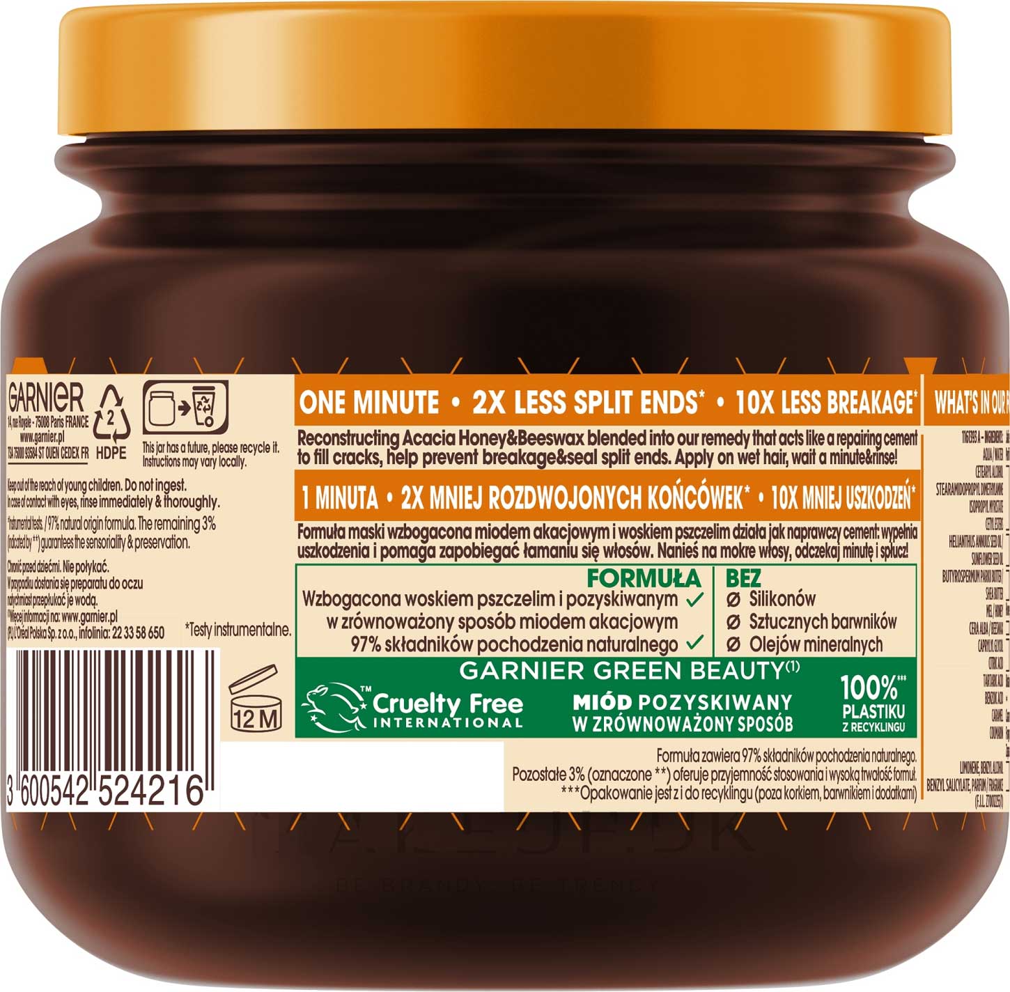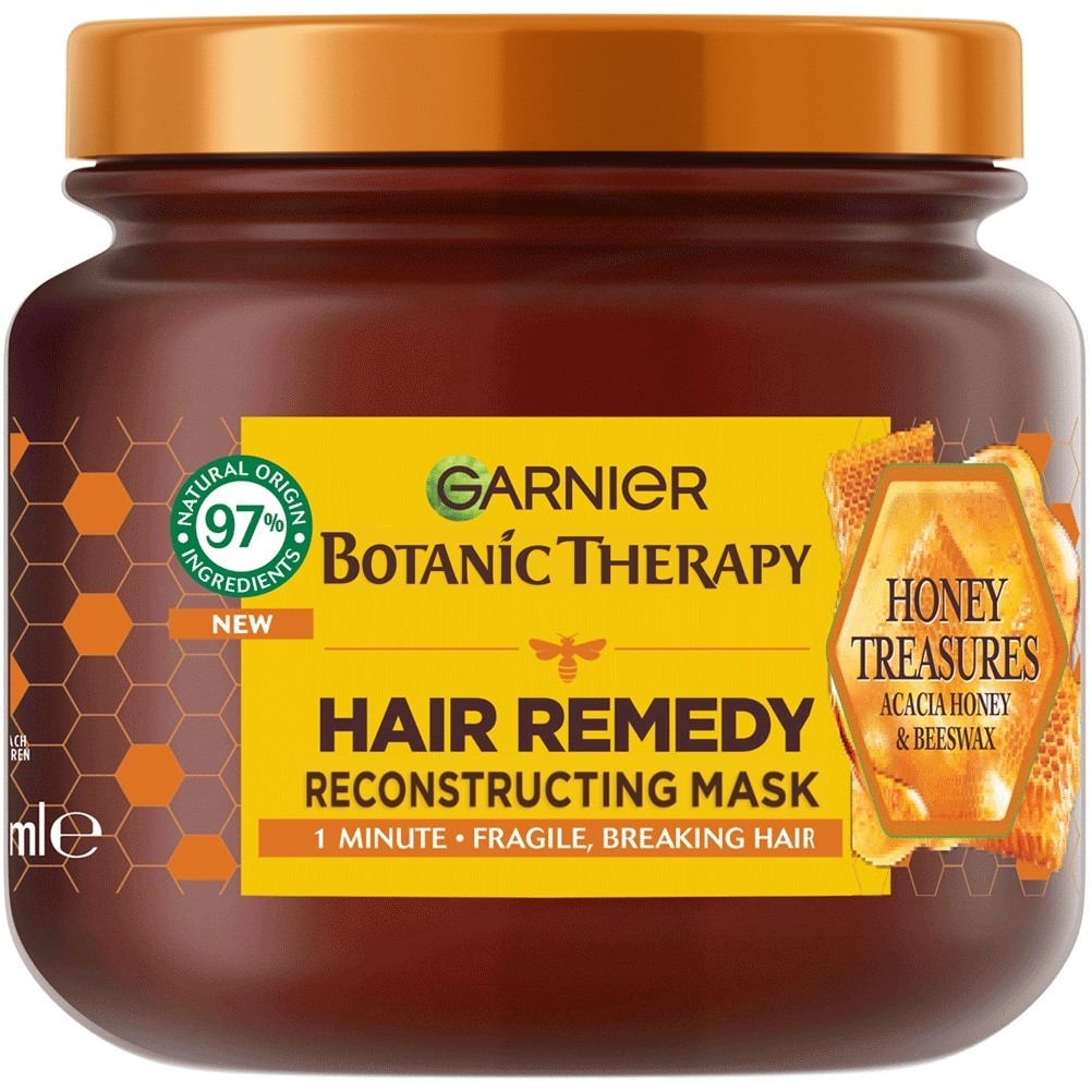 ماسک موی بازسازی کننده و ضد شکنندگی عسل گارنیه Hair Remedy Honey حاوی بیش از 97 درصد عصاره های طبیعی برای ترمیم ساختار موهای آسیب دیده و مستعد شکنندگی و افزایش مقاومت موها در برابر حالت دهی می باشد. ماسک موی گارنیه حاوی عسل اقاقیا بدست آمده از جنگل های اقاقیا در اروپا برای تغذیه و ترمیم فیبر مو و موم زنبور عسل برای ایجاد لایه محافظ رطوبت در اطراف ساقه مو و جلوگیری از کاهش رطوبت و شکنندگی موها می باشد. این ترکیب با قرار گیری در ترک ها و تخلخل های فیبر موهای آسیب دیده باعث ایجاد سطح یکدست و کاهش 10 برابری شکنندگی موها شده و همچنین به کاهش موخوره و انتهای دوشاخه موها کمک می کند، در نتیجه موهایی بازسازی شده، مستحکم تر و مقاوم تر در برابر شکنندگی و حالت دهی خواهیم داشت.