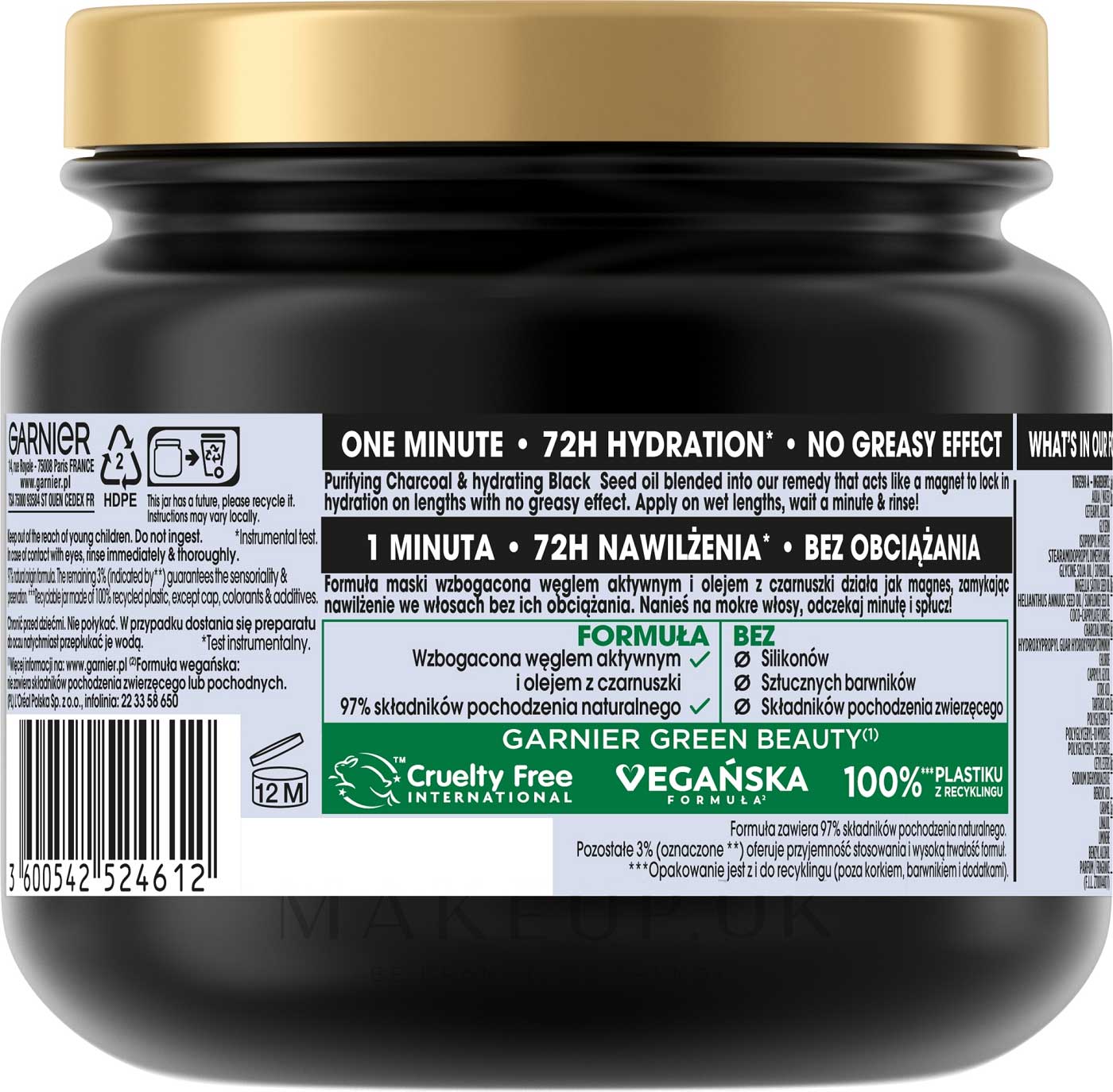 ماسک موی پاکسازی و آبرسان ذغال و روغن سیاه دانه گارنیه Magnetic Charcoal دارای فرمول نوآورانه حاصل از ترکیب ذغال سیاه با خواص پاک کنندگی، رفع چربی اضافی و تصفیه و خالص سازی پوست سر و ریشه چرب موها می باشد که با روغن سیاه دانه جهت تسکین پوست سر حساس و آبرسانی ساقه خشک موها همراه شده است. نتیجه احساس موهایی تازه، سالم و سبک با نمای درخشان و سه برابر تغذیه شده است که همراه با تسکین پوست سر حساس و رطوبت رسانی، تا 72 ساعت کنترل کننده صافی موها می باشد. ماسک موی ذغال و سیاه دانه گارنیه دارای رایحه دلپذیر ماندگار است و موها را کاملا خوشبو می کند.
