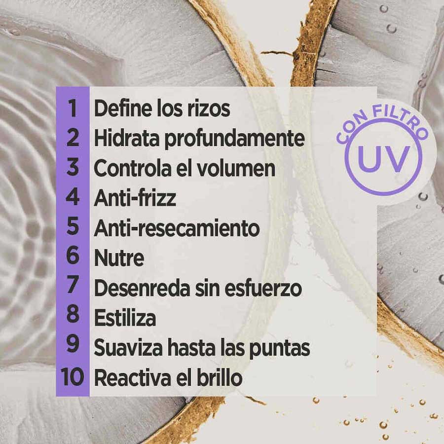 کرم مراقبت موهای فر 10 کاره گارنیه Garnier Fructis Rizos حاوی عصاره های طبیعی برای تغذیه و مراقبت موهای فر با 10 عملکرد شامل: تعریف فرهای زیبا، آبرسانی عمیق، کنترل حجم مو، مقابله با موخوره و دوشاخه شدن، مقابله با خشکی مو، تغذیه تارهای مو، باز کردن گره های مو، لطیف کردن موها، حالت دهی فرهای خارج از حالت و معلق و احیای درخشندگی موها می باشد. کرم موهای فر گارنیه حاوی پروتئین میوه و روغن نارگیل برای تغذیه، استحکام بخشی و تعریف فرهای زیبا و کاهش حجم اضافی می باشد. با استفاده از این ترکیب برای 72 ساعت موهایی فر و زیبا و بدون وز خواهیم داشت.