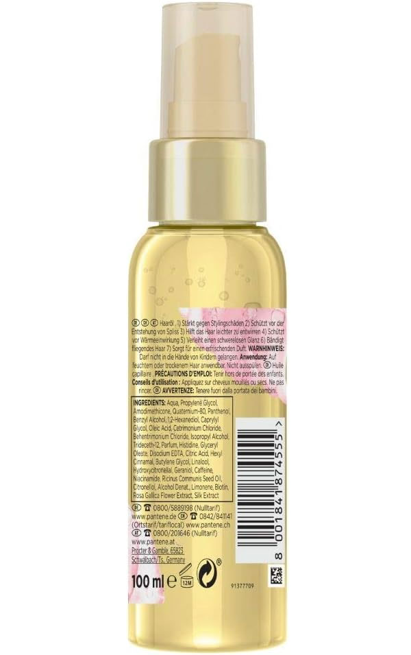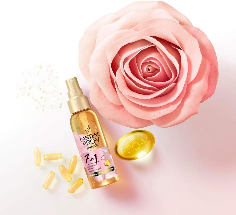 اسپری روغن های مغذی و محافظت موی پنتن میراکل Pantene Miracles 7in1 دارای فرمول تایید شده توسط موسسه ویتامین سوئیس و دارای 7 عملکرد شامل: استحکام بخشی موهای ضعیف در برابر آسیب حالت دهی، محافظت در برابر موخوره و دوشاخه شدن، باز کردن گره موهای آشفته، مراقبت حرارتی در برابر ابزار حالت دهنده، درخشندگی سبک، رفع وز و موهای معلق در هوا و رایحه باطراوت و تازه می باشد. اسپری موی پنتن حاوی پرو ویتامین B5 با خاصیت ترمیم کنندگی 2 برابر قوی تر از روغن به همراه روغن کرچک برای تغذیه و محافظت مو، بیوتین برای تقویت ریشه و ساقه مو، عصاره گل رز برای شادابی موها، نیاسین آمید برای ترمیم و تقویت مو و عصاره ابریشم برای لطافت بخشی موها است. این ترکیب ضمن مراقبت روزانه، موهایی لطیف، بدون وز و زیبا را به ارمغان می آورد.