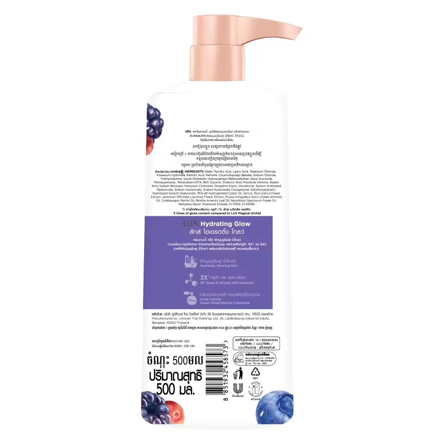شامپو بدن آبرسان و روشن کننده میوه های بری لوکس Lux Hydrating Glow حاوی رایحه دلپذیر میوه های بری شیرین به همراه 3 برابر عصاره گیاهی گلوتا برای درخشندگی و روشن کنندگی پوست است. شامپو بدن لوکس ضمن پاک کنندگی، مراقبت کننده لطافت پوست، مرطوب کننده و خوشبو کننده طولانی مدت بدن می باشد و حس طراوت و تازگی را در طول روز به ارمغان می آورد. مواد موثر و عصاره های طبیعی مغذی و رطوبت رسان دیگر شامپو بدن میوه های بری لوکس شامل موارد زیر است:
