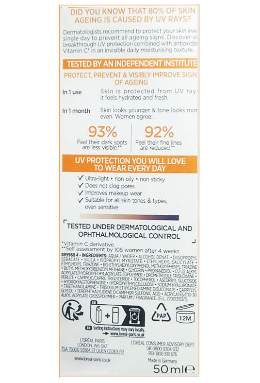 فلویید ضدآفتاب ضد لک و ضد چروک لورال رویتالیفت Revitalift Clinical SPF50 دارای فرمول کلینیکال برای محافظت موفق در برابر پرتوهای UV همراه با آنتی اکسیدان های ضدپیری و کاهش دهنده لک در بافت بسیار سبک با سه عملکرد محافظت، جلوگیری و تصحیح علائم پیری می باشد. فلویید ضدآفتاب لورال حاوی آنتی اکسیدان ویتامین سی برای روشن کنندگی، کاهش لک و محافظت در برابر آلودگی و عوامل محیطی و ویتامین E برای مقابله با علائم پیری و تقویت خاصیت آنتی اکسیدانی است. این ترکیب همچنین حاوی گلیسیرین و هیالورونیک اسید برای آبرسانی و پر کردن خطوط چروک و افزایش فربگی پوست است. ضدآفتاب رویتالیفت همچنین دارای فناوری نت لاک NETLOCK برای حفظ محافظت قدرتمند در بافت نامرئی و سبک ضدآفتاب با جذب شوندگی سریع و بدون ایجاد باقیمانده سفید می باشد.