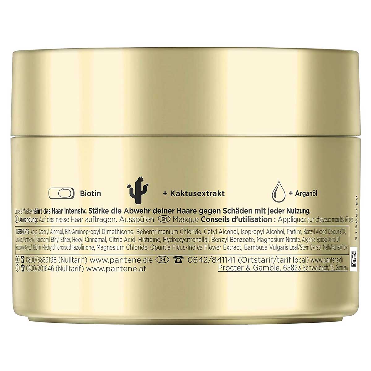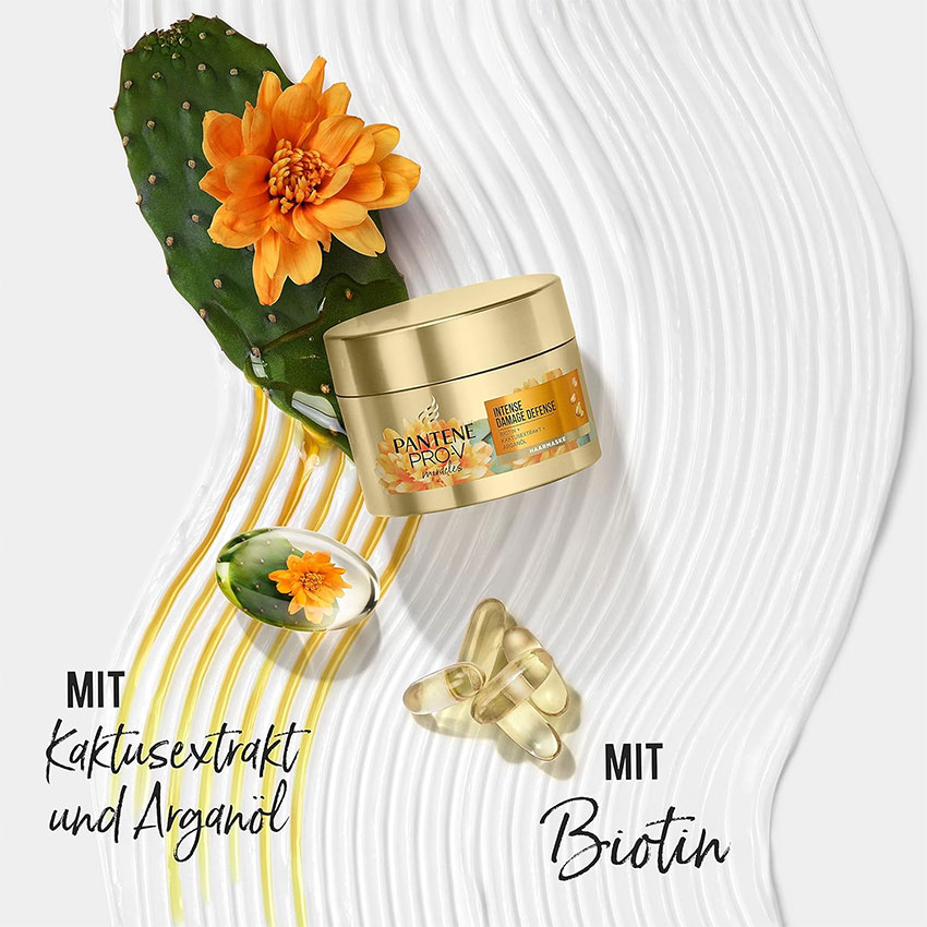 ماسک موی ترمیم کننده قوی پنتن میراکل Intense Damage Defense دارای فرمول تست شده توسط موسسه ویتامین سوئیس برای ترمیم و تغذیه عمیق موهای آشفته و محافظت از موها در برابر آسیب دیدگی و وز می باشد. ماسک موی میراکل پنتن حاوی بیوتین (ویتامین B7) برای تقویت ریشه و ساقه مو و محافظت از سلامتی موها است که با عصاره کاکتوس برای رطوبت رسانی و افزایش ماندگاری رطوبت در فیبر مو، پنتنول (پرو ویتامین B5) برای ترمیم و محافظت موها و روغن آرگان برای رفع وز و تغذیه قوی موها می باشد، در نتیجه موهایی بدون وز، رطوبت رسانی شده و منظم خواهیم داشت.