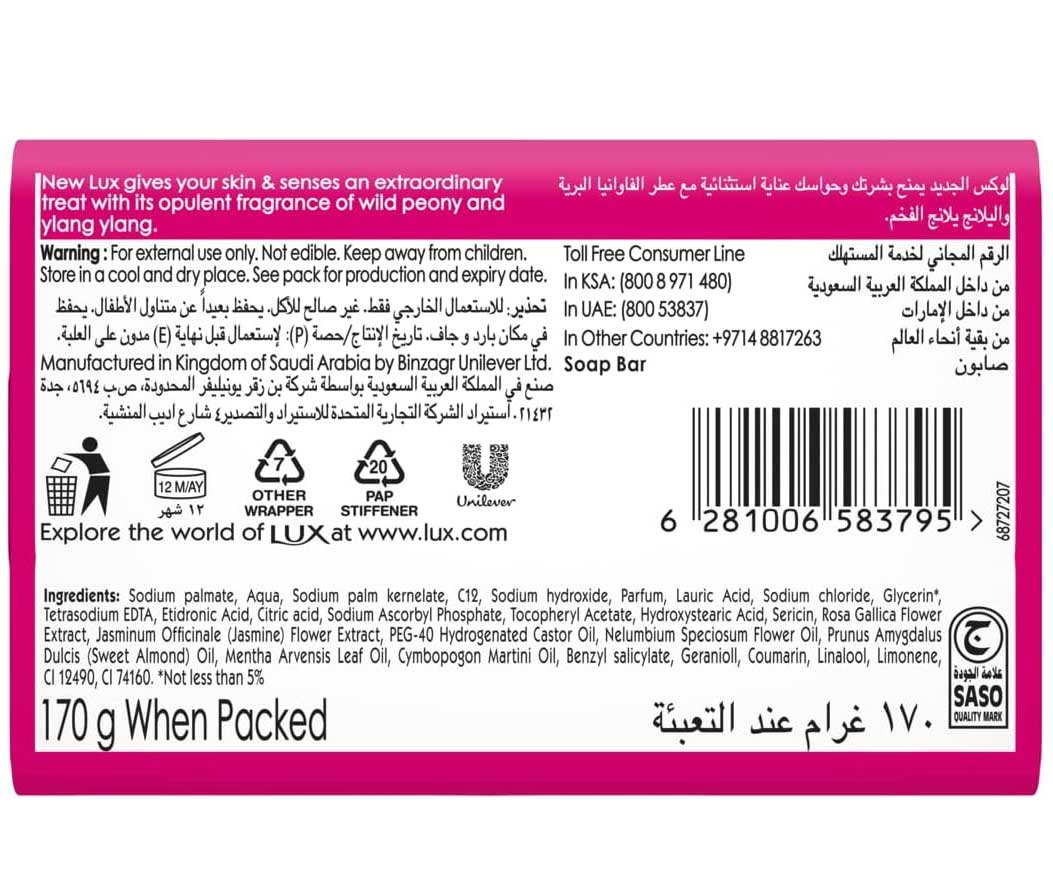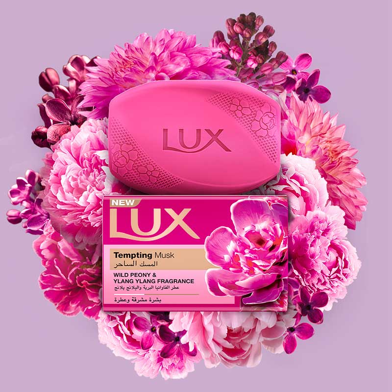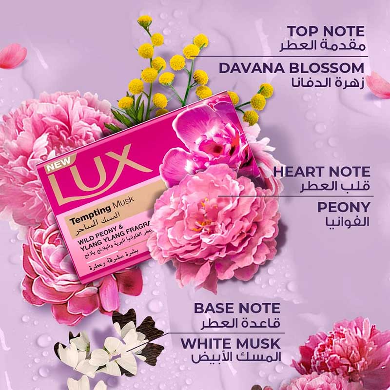 صابون لوکس رایحه مشک LUX Tempting Musk دارای فرمول جدید برای پاک کنندگی ملایم و لطیف پوست به همراه روغن های مغذی و تغذیه کننده می باشد. صابون لوکس تمپتینگ حاوی روغن بادام برای تغذیه پوست، روغن گل نیلوفر آبی برای لطافت و مراقبت پوست و روغن نعناع و روغن علف لیمو برای شادابی و طراوت است. این ترکیب فوم غنی کرمی و لطیف ایجاد می کند و دارای رایحه آغازین شکوفه گل داوانا (از خانواده گیاه درمنه) و گل یلانگ یلانگ، رایحه میانی گل رز پئونی وحشی و رایحه پایه مشک سفید است و پوست خوشبوی طولانی مدت را به ارمغان می آورد.