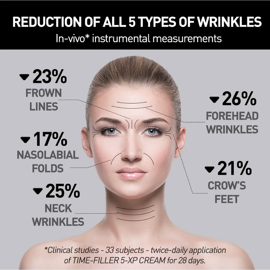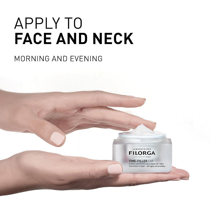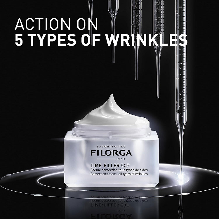 کرم ضدچروک پوست نرمال و خشک فیلورگا تایم فیلر Filorga Time Filler 5XP دارای فرمول ویژه برای رفع تمامی انواع چروک شامل چروک های سطح پوست، چروک های ناشی از خشکی، چروک های عمیق، چروک های ناشی از انقباض میمیک صورت و چروک های گردن است. کرم تایم فیلر 5 روش پزشکی زیبایی را برای تصحیح چروک های پنج گانه صورت و گردن بکار گرفته است، این فرمول حاوی کمپلکس تری پپتیدهای قوی ریلکس کننده و صاف کننده پوست، هیالورونیک اسید برای آبرسانی، رازیانه دریایی غنی از مواد معدنی و کمپلکس مواد فعال بازسازی کننده پوست است و چروک دینامیک را کاهش داده و پوست صورت و گردن را ریلکس می کند.