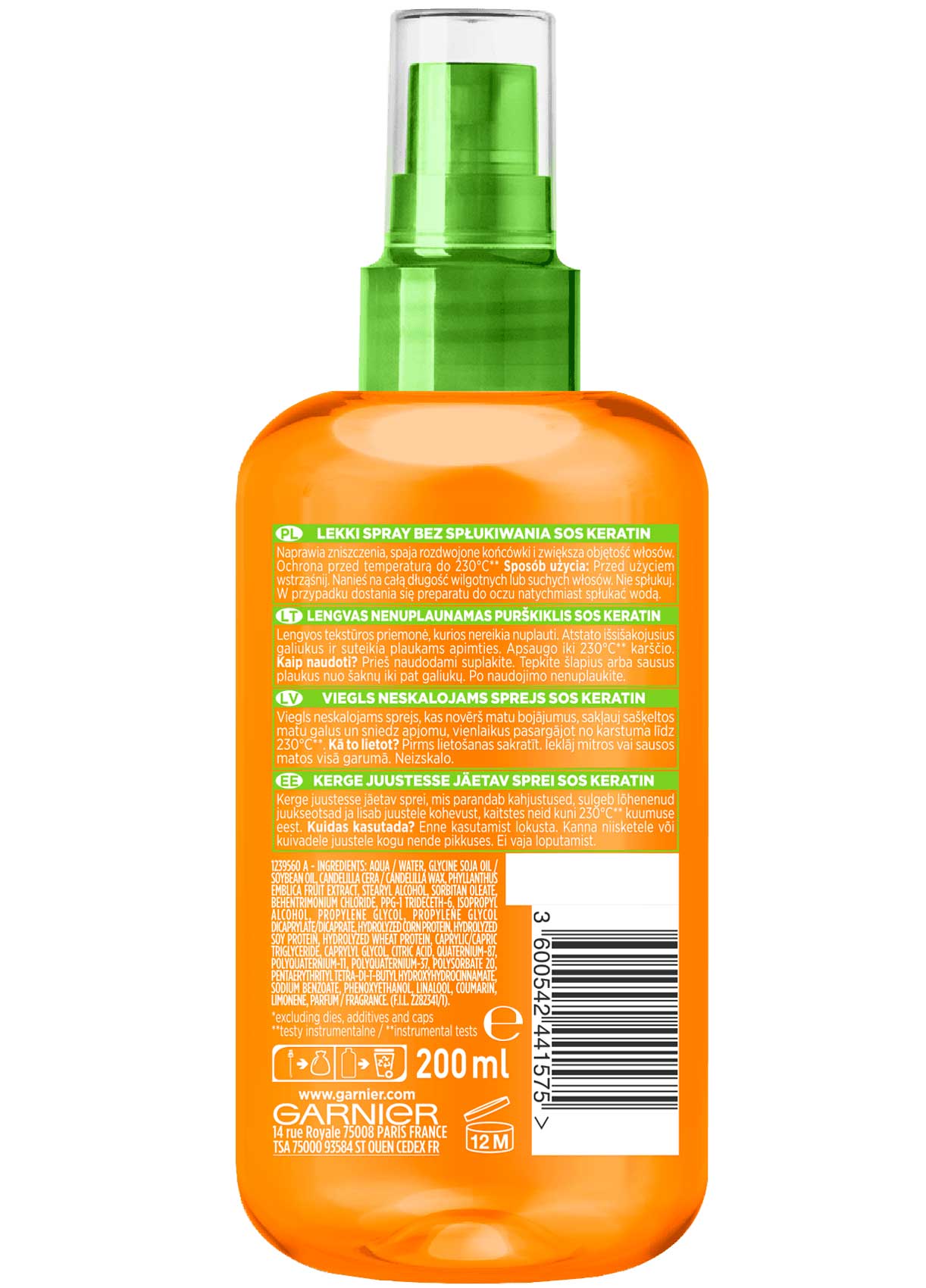 سرم اسپری ترمیم کننده موی کراتین گارنیه Garnier Sos Keratin حاوی عصاره های طبیعی و بافت سبک برای ترمیم آسیب دیدگی های یکساله موها در طی یک هفته، کاهش موخوره و انتهای دوشاخه، افزایش حجم موهای نازک و محافظت حرارتی در برابر ابزار حالت دهنده مو تا 230 درجه سانتی گراد می باشد. سرم اسپری گارنیه حاوی کراتین گیاهی مایع برای ترمیم و بازسازی سطح مو و روغن میوه آملا (انگور فرنگی هندی) برای پر کردن تخلل های ناشی از شکستن و آسیب دیدگی های محیطی است، در نتیجه موهایی بازسازی شده، لطیف، درخشان و منعطف خواهیم داشت.
