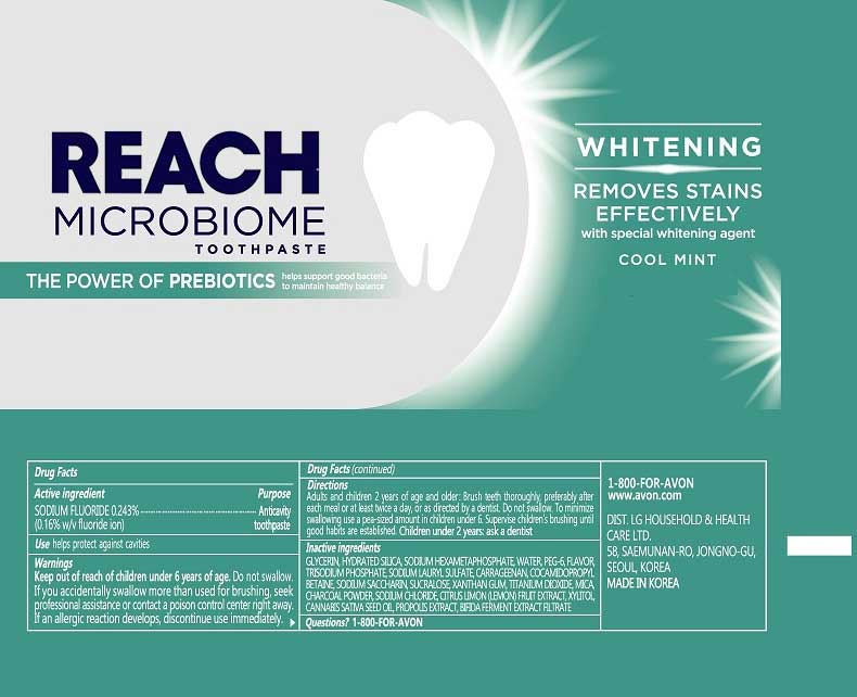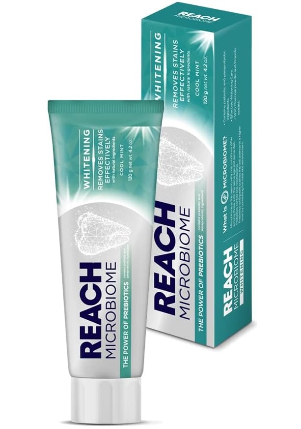 خمیردندان سفیدکننده ریچ میکروبیوم Reach Whitening دارای فناوری میکروبیوم و حاوی پری بیوتیک هایی است که به حفظ تعادل بهداشت دهان و دندان کمک می کند و همراه با فلوراید، با پلاک و پوسیدگی دندان مبارزه کرده و تنفس تازه را تقویت می کند. این ترکیب متشکل از میکرو فلور مفید پری بیوتیک های تخمیر شده بیفیدو است که یک لایه محافظ ایجاد می کند و به حفظ سلامت دندان ها و لثه کمک می کند. مسواک زدن می تواند به پاک کردن باکتری های بد که در بافت لثه پنهان شده اند کمک کند، اما خمیردندان ریچ با پری بیوتیک ها می تواند به بهبود تعادل میکروبیوم به نفع باکتری های خوب برای حمایت از سلامت دهان و دندان کمک کند. مواد موثر دیگر این فرمول شامل عصاره لیمو برای سفیدکنندگی دندان ها، زغال فعال شارکل برای پاک کنندگی و رفع بوی دهان، عصاره پروپولیس (موم زنبور عسل)، روغن شاه دانه و نعناع برای خنک کنندگی و تازگی بخشی می باشد.