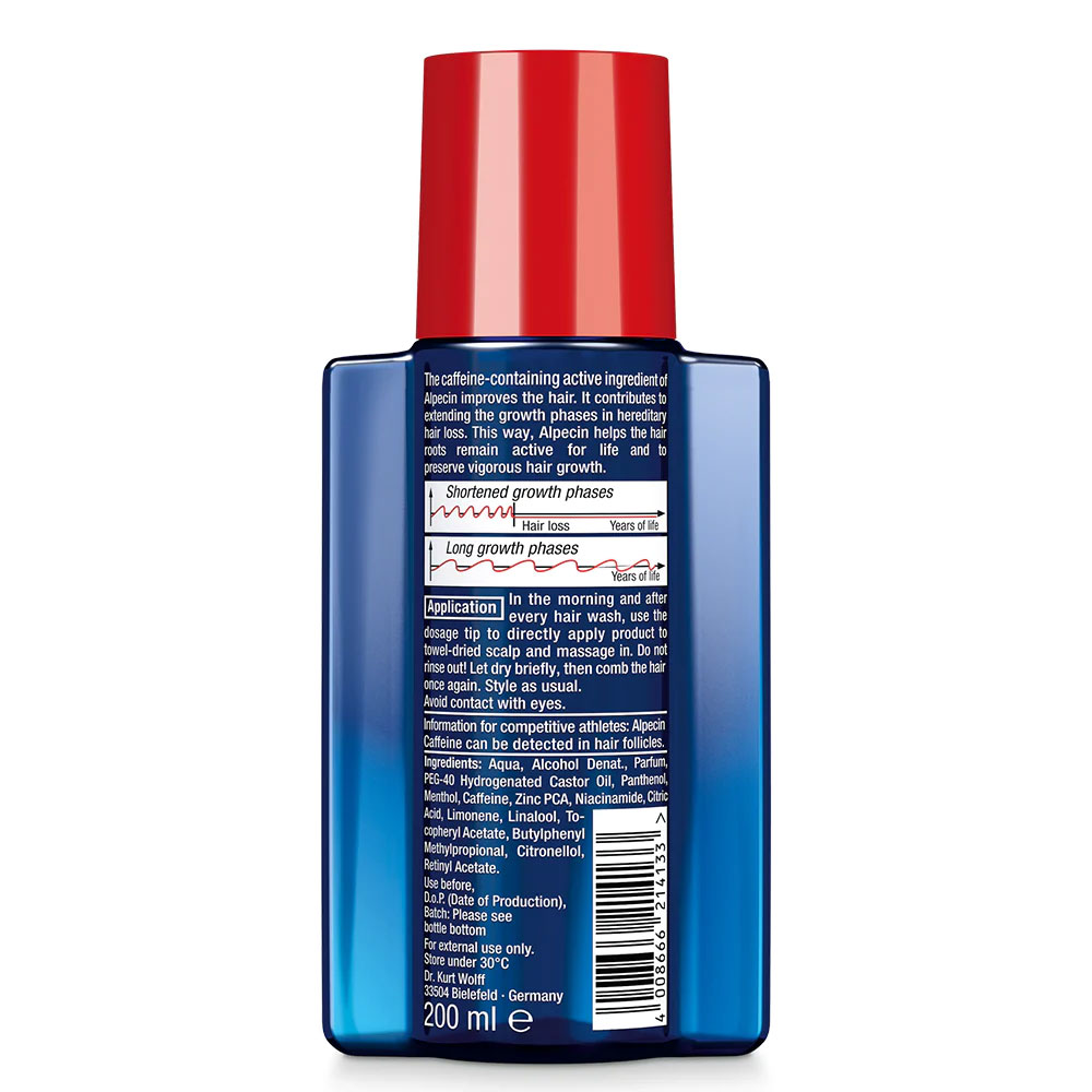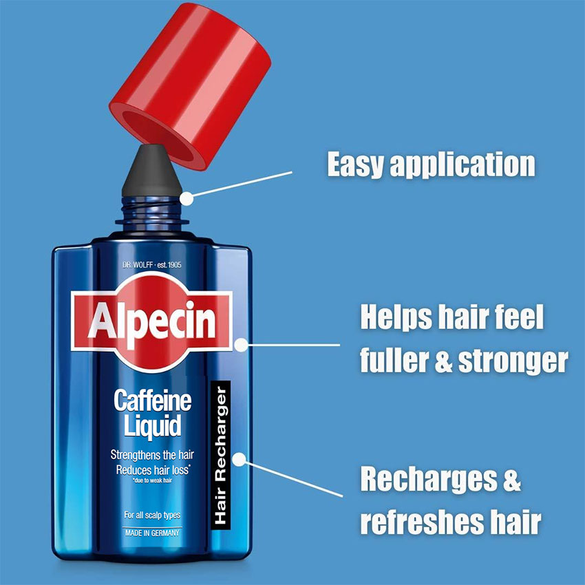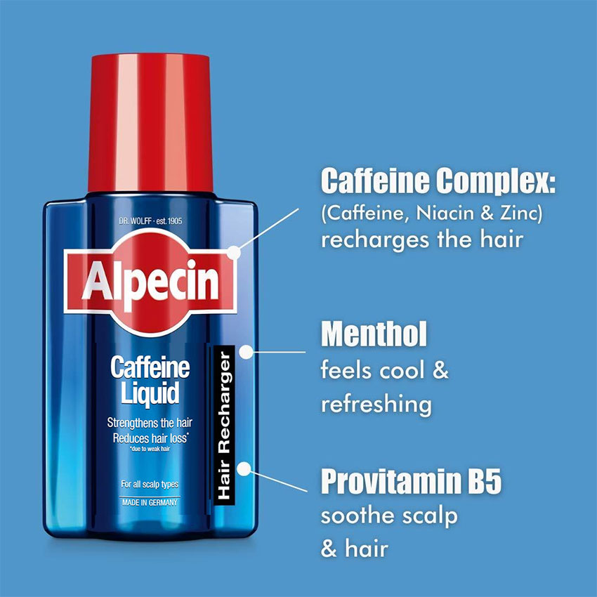 تونیک ضد ریزش موی کافئین آلپسین Alpecin Caffeine Liquid دارای فرمول پیشرفته توسعه یافته در آزمایشگاه دکتر ولف مناسب برای تقویت موهای ضعیف و نازک و کاهش ریزش مو می باشد. تونیک ضدریزش آلپسین حاوی کمپلکس مواد موثر کافئین، زینک و نیاسین (ویتامین B3) برای تقویت، مقابله با ریزش و افزایش استحکام ریشه موها است، این ترکیب به وسیله انرژی بخشی به ریشه موهای ضعیف باعث افزایش فاز رشد موها و در نتیجه کاهش فاز ریزش می شود. دوز کافئین تونیک آلپسین برای تامین میزان ضروری یک روز ریشه موها طراحی شده و هنگام استفاده احساس سوزن سوزن شدن را حس می کنیم. این ترکیب همچنین حاوی عصاره نعناع برای افزایش گردش خون پوست سر و شاداب کنندگی و پنتنول (پرو ویتامین B5) برای بازسازی موها و تسکین پوست سر است.