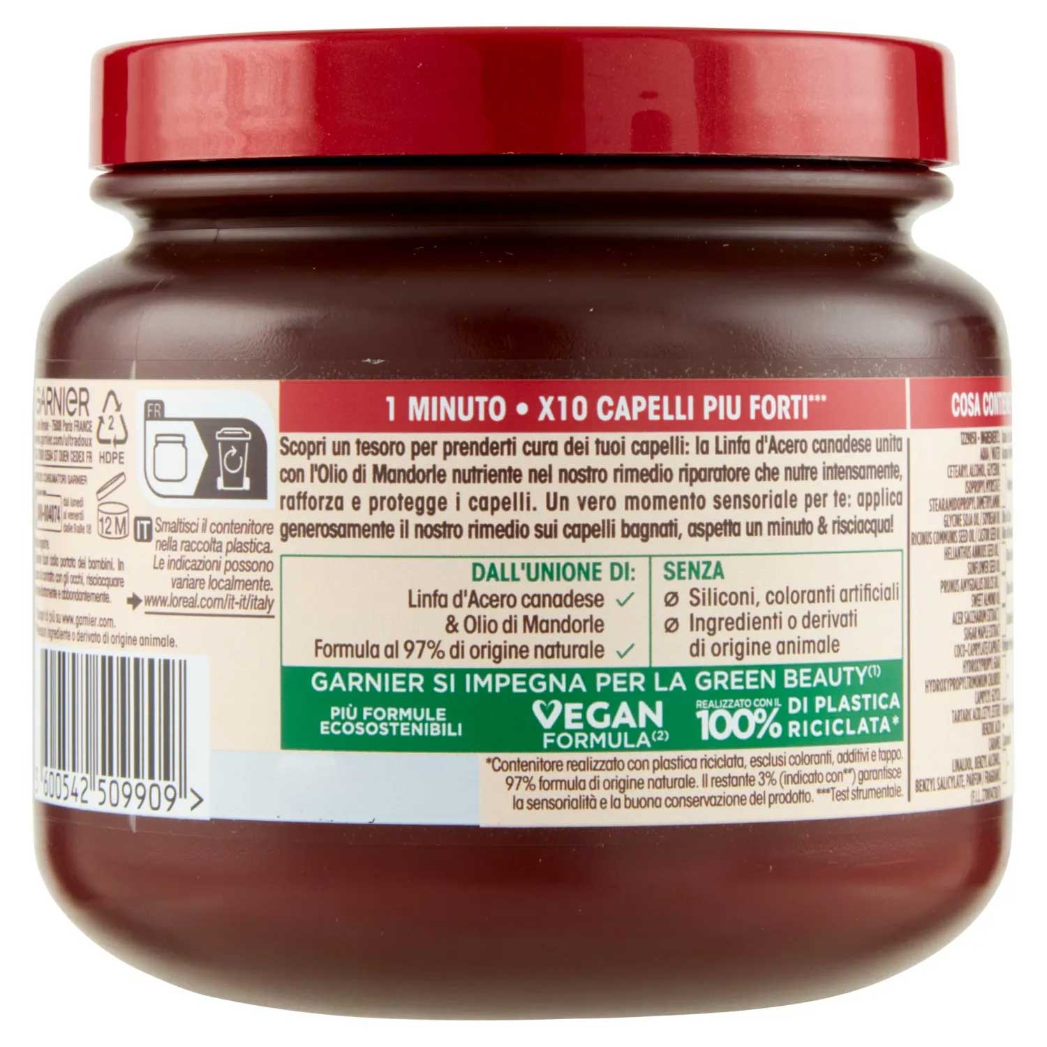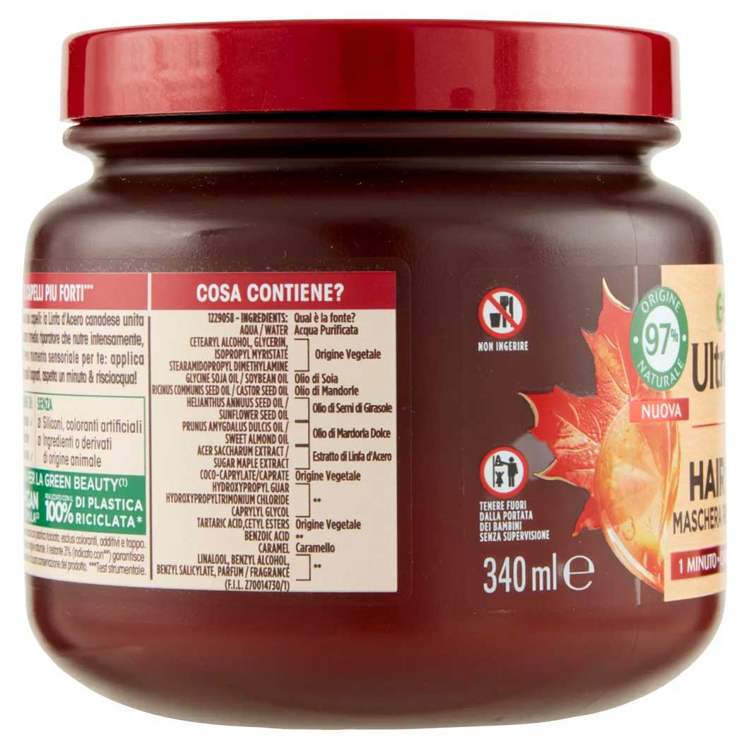 ماسک موی ترمیم کننده افرای گارنیه Garnier Ultra Dolce Rimedio Maple حاوی بیش از 97 درصد عصاره های طبیعی برای تغذیه قوی و ترمیم موهای آسیب دیده، افزایش استحکام مو و محافظت در برابر آسیب های آینده می باشد. ماسک موی گارنیه حاوی شیره درخت افرا بدست آمده از طبیعت وحش کانادا با خواص ترمیم کنندگی و بازسازی مو به همراه روغن کرچک سرشار از اسیدهای چرب با خواص تغذیه کنندگی و استحکام بخشی موها و روغن بادام برای لطافت بخشی و محافظت فیبر مو می باشد. این فرمول با رایحه دلپذیر و بدون سیلیکون و مواد مضره، درمانی طبیعی را برای موها فراهم می کند، نتیجه موهایی بازسازی شده و مستحکم می باشد.