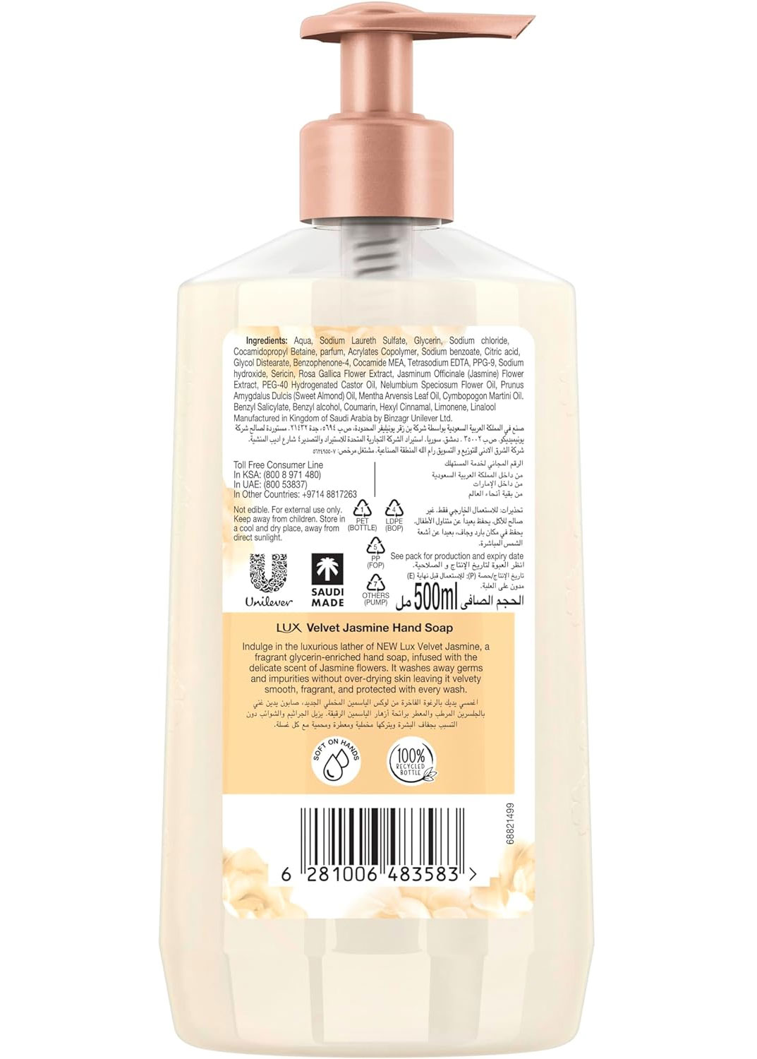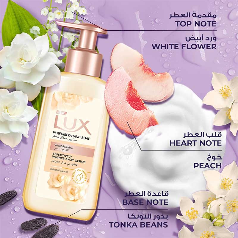 مایع دستشویی گل یاس لوکس Lux Jasmine Hand Wash دارای فرمول معطر و آنتی باکتریال غنی شده با گلیسیرین با کف غنی و رایحه لطیف ماندگار است. مایع دستشویی لوکس حاوی عصاره گل یاس با رایحه دلپذیر و لطیف است و فرمول شوینده آن دست ها را عمیقا تمیز می کند، میکروب ها و آلودگی ها را بدون خشکی پوست از بین می برد و دست هایی لطیف، تمیز و خوشبو مانند گل ها را به ارمغان می آورد.
