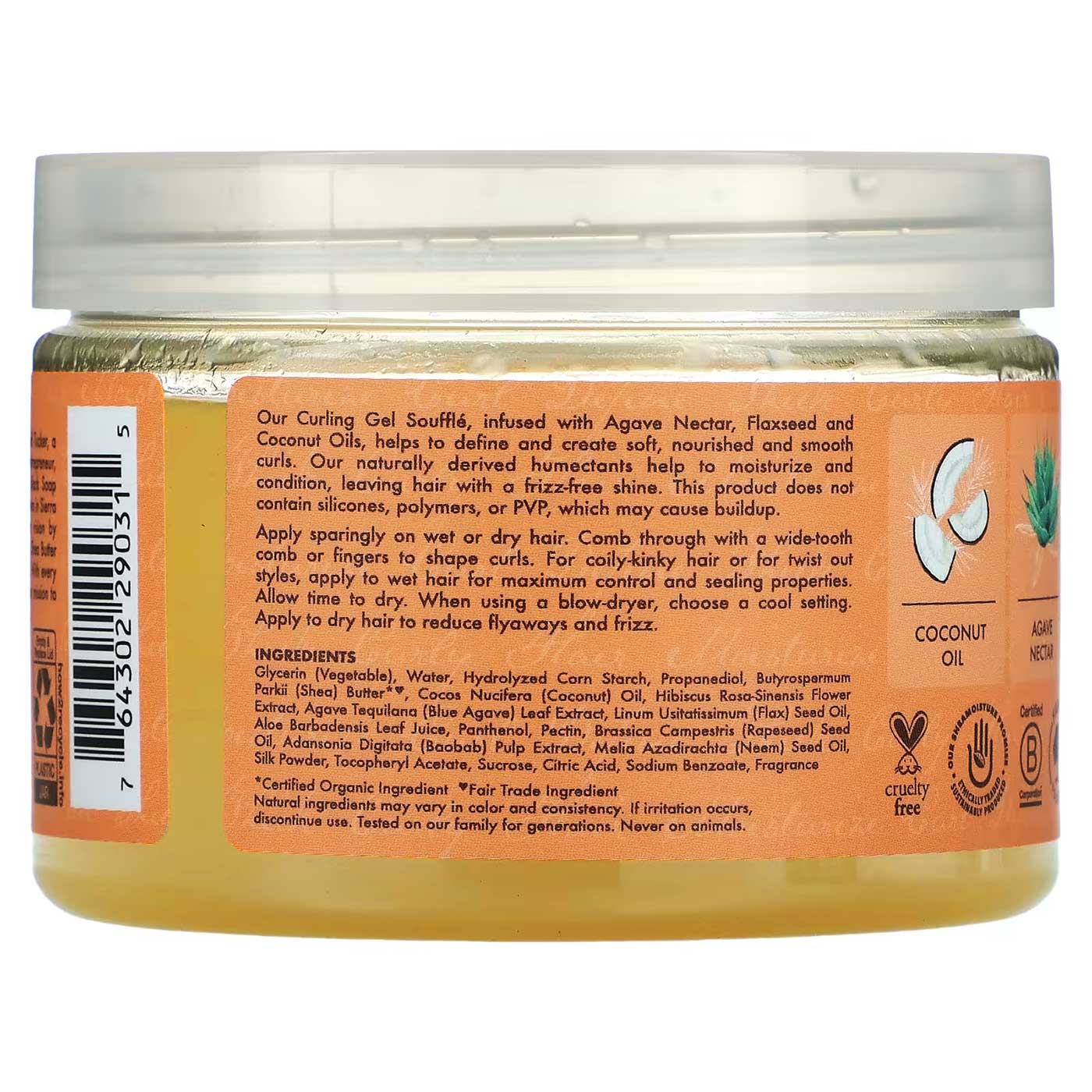 ژل حالت دهنده موهای فر شی مویسچر Shea Moisture Curling Gel Souffle محصولی باکیفیت و حاوی عصاره های طبیعی برای تعریف و حالت دهی فرهای لطیف، تغذیه شده و منظم می باشد. ژل موی شی مویسچر غنی شده با عصاره گیاه آگاو، روغن دانه کتان و نارگیل برای رطوبت رسانی عمیق، تغذیه و ایجاد موهای فر درخشان و بدون وز است. این فرمول دارای بافت سوفله بوده و بدون مواد باقیمانده پس از حالت دهی روی موها از جمله سیلیکون، پلیمر و PVP می باشد. عصاره های طبیعی کلید ژل موی شی مویسچر شامل موارد زیر است: