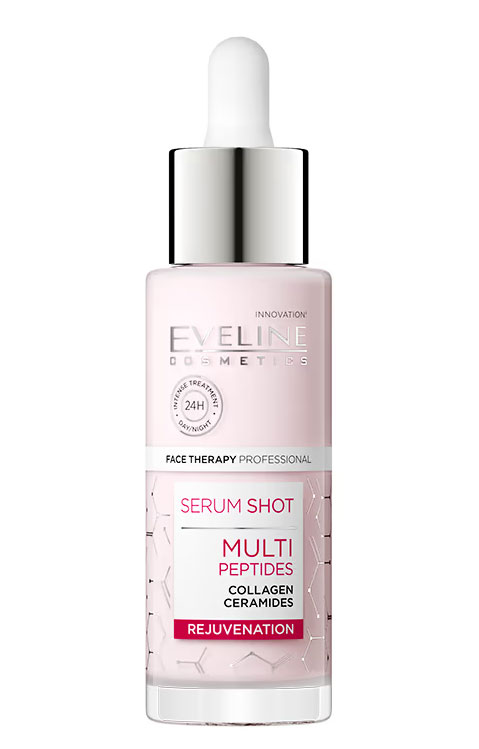 سرم جوانسازی و پرکننده خطوط اولاین مولتی پپتید Eveline Multi Peptides دارای فرمول حاوی چندین فناوری ضد پیری با دوز بالا متشکل از 12 پپتید مغذی و بازسازی کننده پوست های بالغ و نیازمند تغذیه و افزایش صافی خطوط دینامیک و چروک های صورت می باشد. سرم جوانسازی اولاین حاوی کلاژن برای افزایش خاصیت ارتجاعی و تراکم پوست و 4 نوع سرامید برای افزایش صافی، کاهش چروک و تقویت سد محافظت طبیعی پوست است. این ترکیب همچنین حاوی جینسینگ با خواص آنتی اکسیدانی و ضدپیری است.