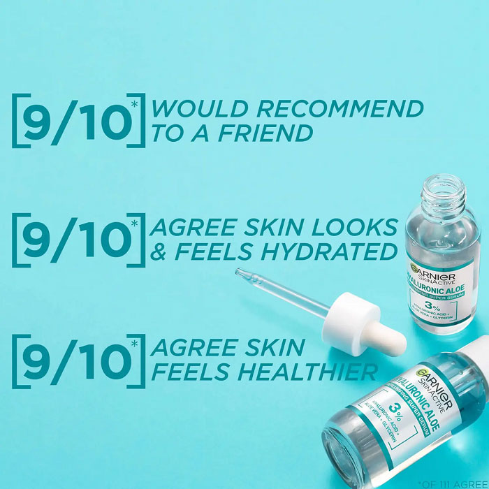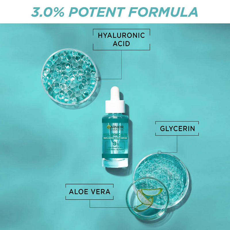 سرم آبرسان و حجیم سازی پوست هیالورونیک و آلوئه ورای گارنیه Garnier Replumping دارای فرمول فربه سازی و آبرسانی قوی پوست توسط ترکیب سه گانه مواد ضروری برای حفظ رطوبت و افزایش مقدار رطوبت سد محافظت پوست است. سرم آبرسان گارنیه حاوی 3 درصد هیالورونیک اسید برای آبرسانی و افزایش قابلیت ارتجاعی، صافی و انعطاف پذیری پوست است. این ترکیب همچنین حاوی گلیسیرین ترکیب شده با آلوئه ورا برای رطوبت رسانی و شادابی صورت و ایجاد نمای هموارتر و درخشان پوست است.
