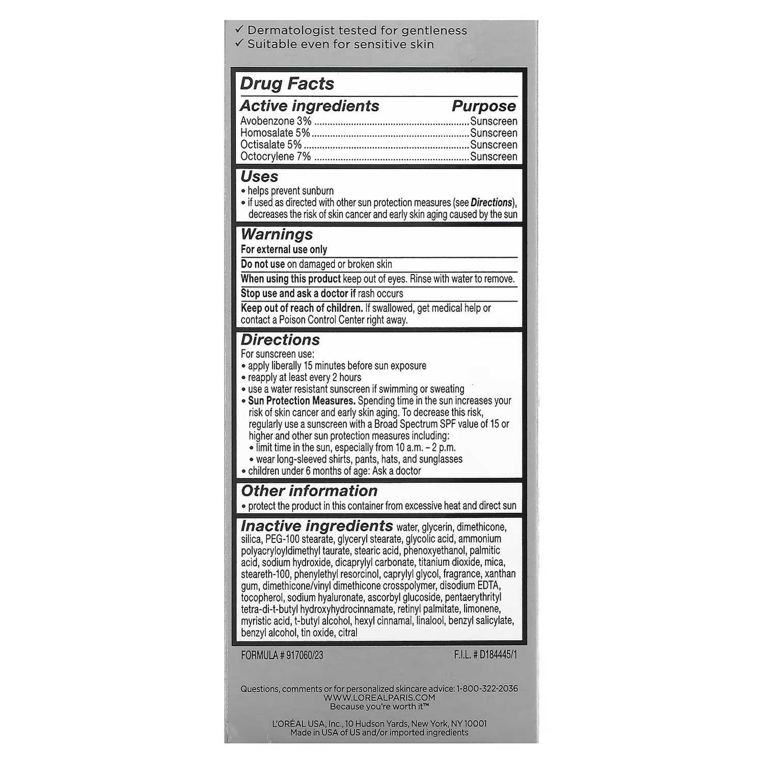 AQUA WATER, GLYCERIN, OCTOCRYLENE, HOMOSALATE, ETHYLHEXYL SALICYLATE, DIMETHICONE, SILICA, BUTYL METHOXYDIBENZOYLMETHANE, PEG-100 STEARATE, GLYCERYL STEARATE, GLYCOLIC ACID, AMMONIUM POLYACRYLOYLDIMETHYL TAURATE, STEARIC ACID, PHENOXYETHANOL, PALMITIC ACID, SODIUM HYDROXIDE, DICAPRYLYL CARBONATE, CI 77891 TITANIUM DIOXIDE, MICA, STEARETH-100, PHENYLETHYL RESORCINOL, CAPRYLYL GLYCOL, PARFUM FRAGRANCE, XANTHAN GUM, DIMETHICONE VINYL DIMETHICONE CROSSPOLYMER, DISODIUM EDTA, TOCOPHEROL, SODIUM HYALURONATE, ASCORBYL GLUCOSIDE, PENTAERYTHRITYL TETRA-DI-T-BUTYL HYDROXYHYDROCINNAMATE, RETINYL PALMITATE, LIMONENE, MYRISTIC ACID, T-BUTYL ALCOHOL, HEXYL CINNAMAL, LINALOOL, BENZYL SALICYLATE, BENZYL ALCOHOL, TIN OXIDE, CITRAL