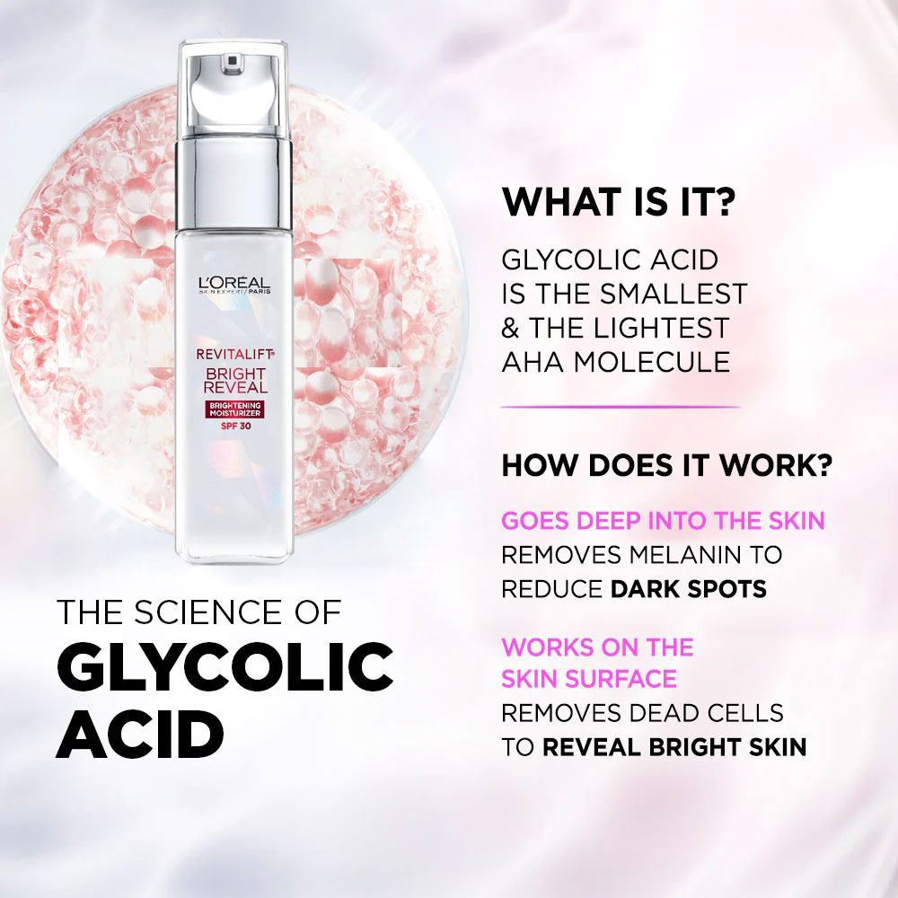 سرم روشن کننده و ضد چروک گلیکولیک اسید لورال رویتالیفت Bright Reveal محصولی باکیفیت و حاوی حاوی مواد موثر روشن کننده تیرگی پوست، کاهش لک، اصلاح ناهمواری های سطح پوست و کاهش چروک ها در طی یک هفته می باشد. سرم برایت رویل لورال حاوی گلیکولیک اسید برای نوسازی و فرم دهی مجدد پوست صورت و ویتامین سی برای روشن کنندگی و کاهش لک است.
