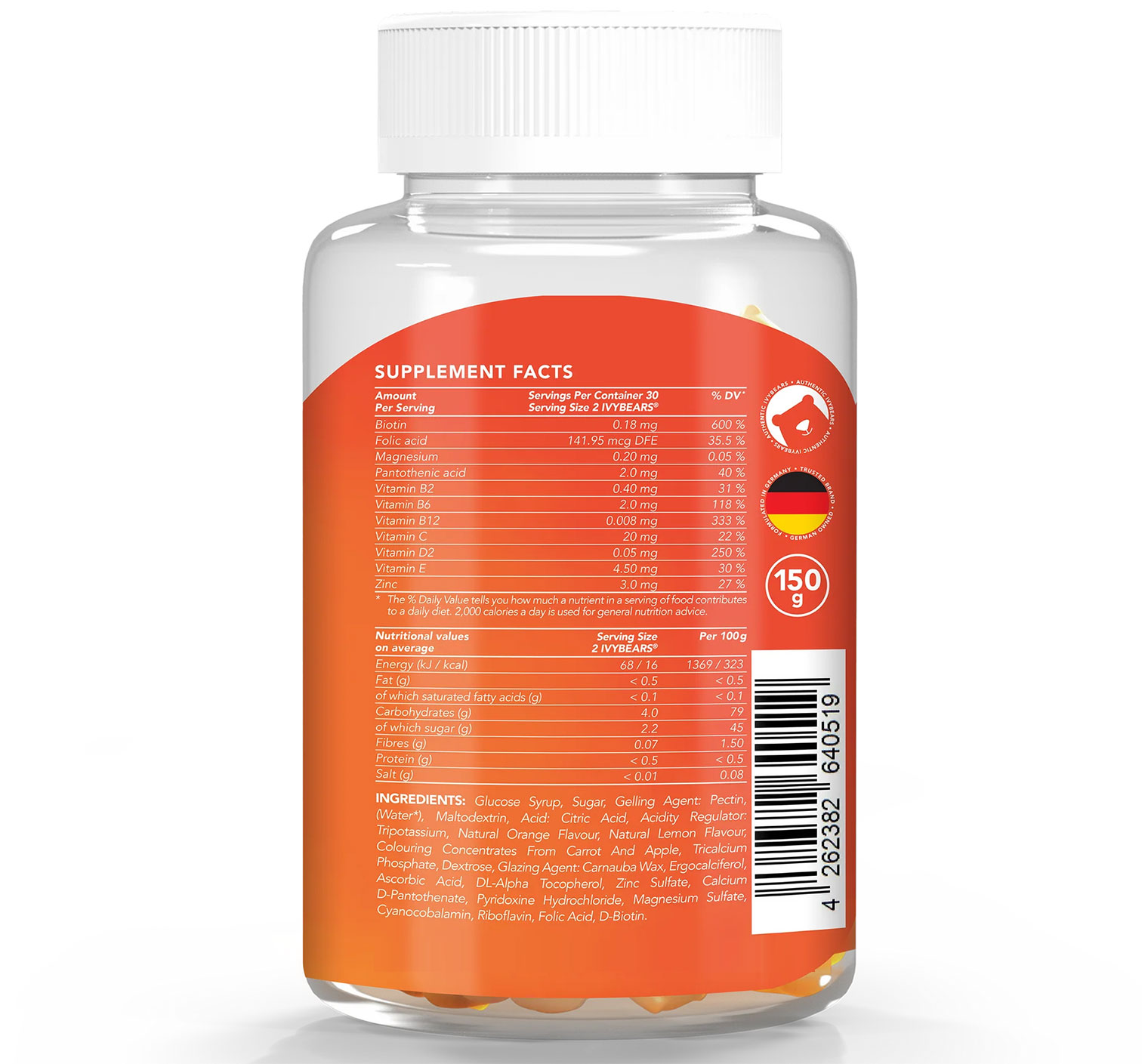 آیوی بیرز IVYBEARS برند آلمانی تولیدکننده مکمل های تقویت پوست، مو و سلامتی است که در کلن قرار دارد و از سال 2012 در حال فعالیت می باشد. هدف آیوی بیرز ارائه دوز بالای ویتامین های ضروری بدن در قالب پاستیل های خوشمزه برای تغییر شیوه مراقبت بدن به فرایند لذت بخش روزانه است. مکمل های آیوی بیرز دارای فرمول وگن و منطبق با استانداردهای روز اتحادیه اروپا هستند و با استقبال روزافزون مصرف کنندگان، تبدیل به پرفروش ترین مکمل ویتامین پاستیلی در اروپا شده است.
