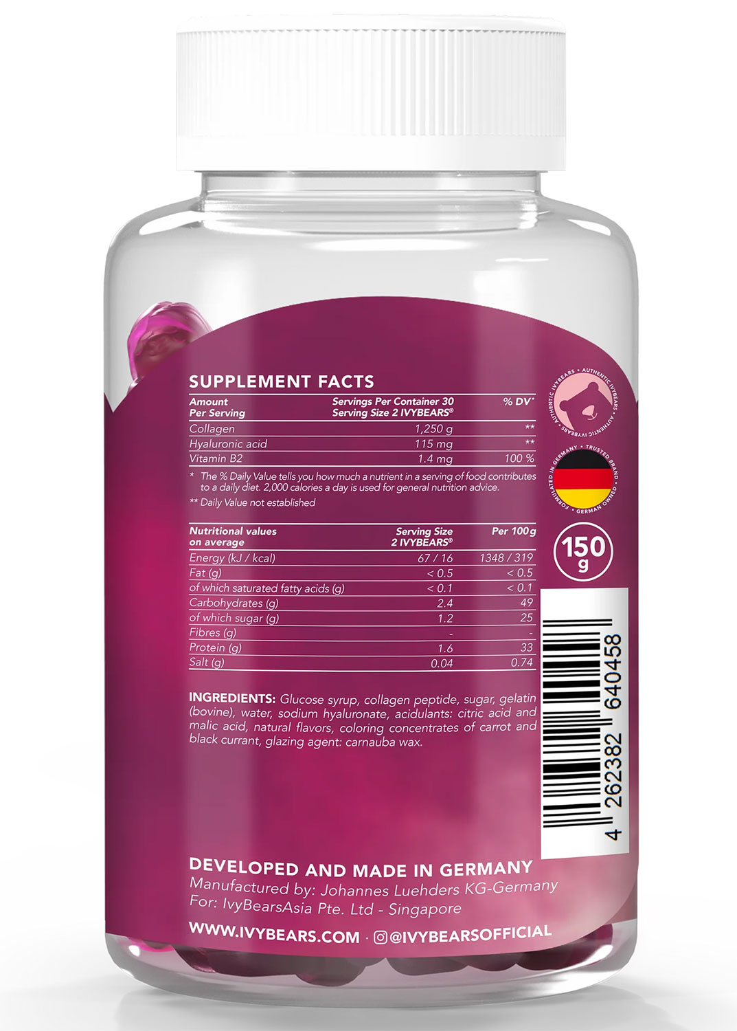 آیوی بیرز IVYBEARS برند آلمانی تولیدکننده مکمل های تقویت پوست، مو و سلامتی است که در کلن قرار دارد و از سال 2012 در حال فعالیت می باشد. هدف آیوی بیرز ارائه دوز بالای ویتامین های ضروری بدن در قالب پاستیل های خوشمزه برای تغییر شیوه مراقبت بدن به فرایند لذت بخش روزانه است. مکمل های آیوی بیرز دارای فرمول وگن و منطبق با استانداردهای روز اتحادیه اروپا هستند و با استقبال روزافزون مصرف کنندگان، تبدیل به پرفروش ترین مکمل ویتامین پاستیلی در اروپا شده است.