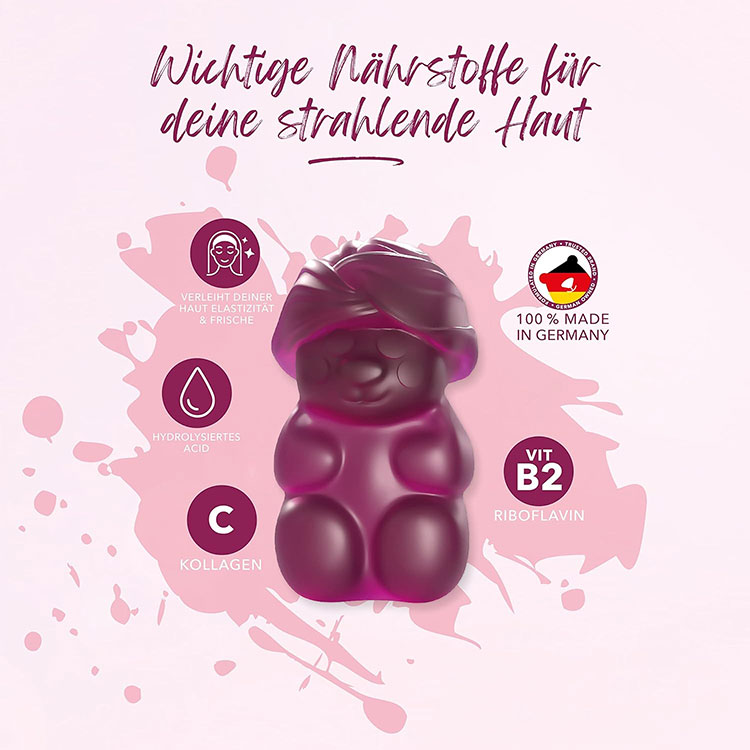 مکمل پاستیل بهبود سلامت پوست آیوی بیرز Ivybears Vibrant Skin دارای فرمول حاوی دوز بالای هیالورونیک اسید و کلاژن برای داشتن پوستی سرزنده، انعطاف پذیر، درخشان، هموار و زیبا است. مکمل پاستیلی سلامت پوست آیوی بیرز سطح رطوبت طبیعی پوست را بازیابی می کند و مواد مغذی لازم برای حفظ و بازگرداندن پوست به شرایط ایده آل را به بافت پوست می رساند. در نتیجه با گذشت زمان پوستی باطراوت و هموار با رنگ چهره بهبود یافته خواهیم داشت.