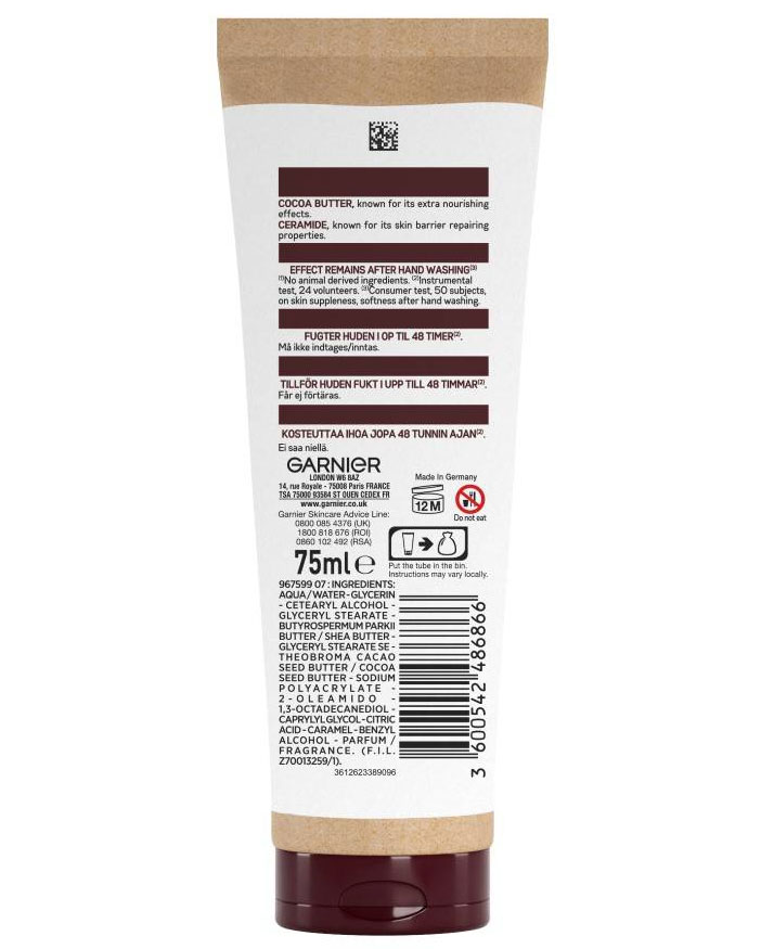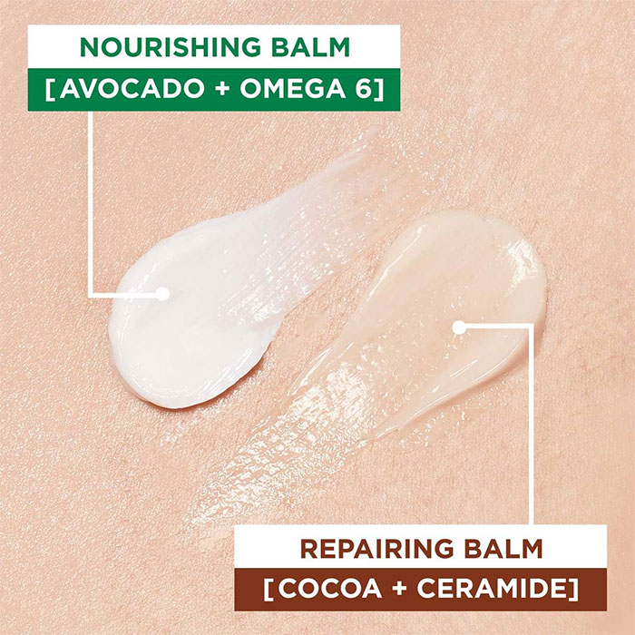بالم ترمیم کننده دست کره کاکائو و سرامید گارنیه سوپرفود Garnier Repairing حاوی بیش از 98 درصد عصاره های طبیعی با غلظت بالا برای آبرسانی 48 ساعته دست، ترمیم کنندگی پوست دست خیلی خشک و زبر و احیای لطافت دست ها می باشد. بالم دست گارنیه حاوی کنستانتره قوی کره کاکائو برای تغذیه پوست و سرامید با خواص ترمیم کنندگی است. تاثیرگذاری این فرمول پس از شستشوی دست ها ادامه پیدا می کند و ضمن تغذیه و حفظ رطوبت در بافت خشک پوست، دست هایی لطیف و هموار را به ارمغان می آورد.