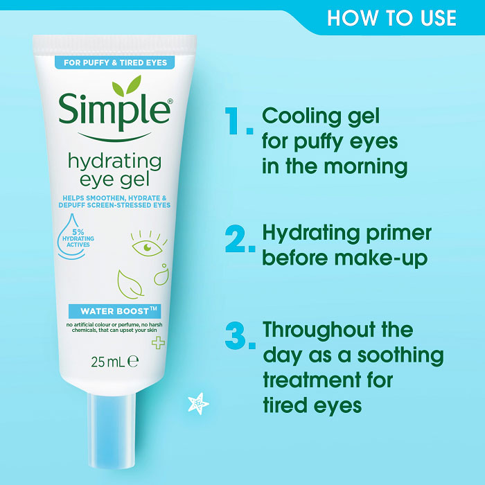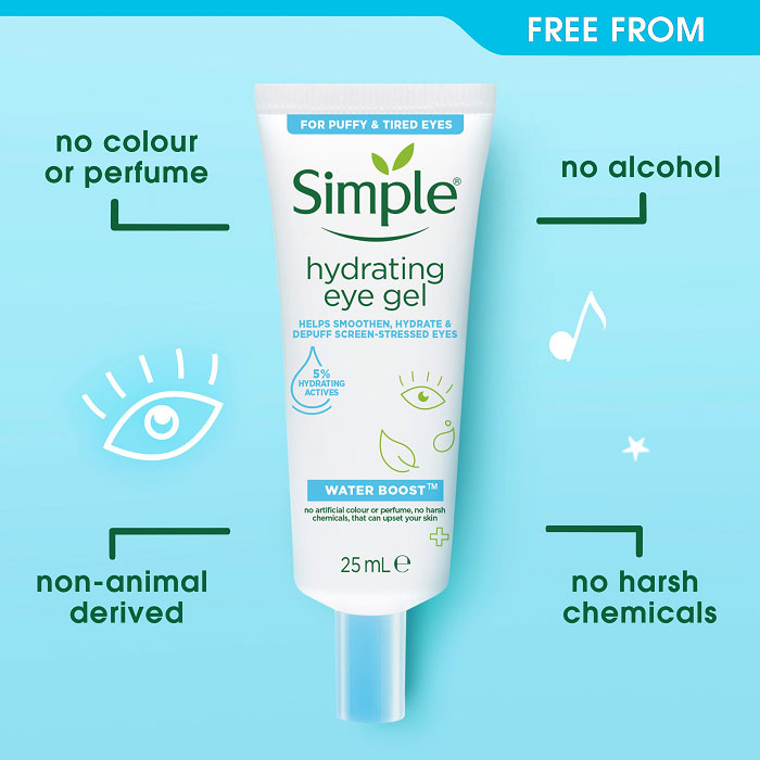 ژل آبرسان دور چشم سیمپل Simple Hydrating Eye دارای فرمول ویژه برای آبرسانی و مراقبت از چشم های خسته در معرض نور آبی صفحه نمایش است. نور منتشر شده از صفحه نمایش موبایل، کامپیوتر و تلویزیون در طولانی مدت باعث ایجاد خستگی، تیرگی و پف زیر چشم می شود. ژل دور چشم سیمپل آبرسانی به پوست خشک و کم آب اطراف چشم های تحت فشار صفحه نمایش را به خوبی انجام می دهد و احساس تجدید حیات فوری را ایجاد می کند. فرمول این ژل شامل 5 درصد مواد فعال آبرسان، پنتاویتین فعال، آنتی اکسیدان قوی یونجه و مواد معدنی احیا کننده دور چشم است.