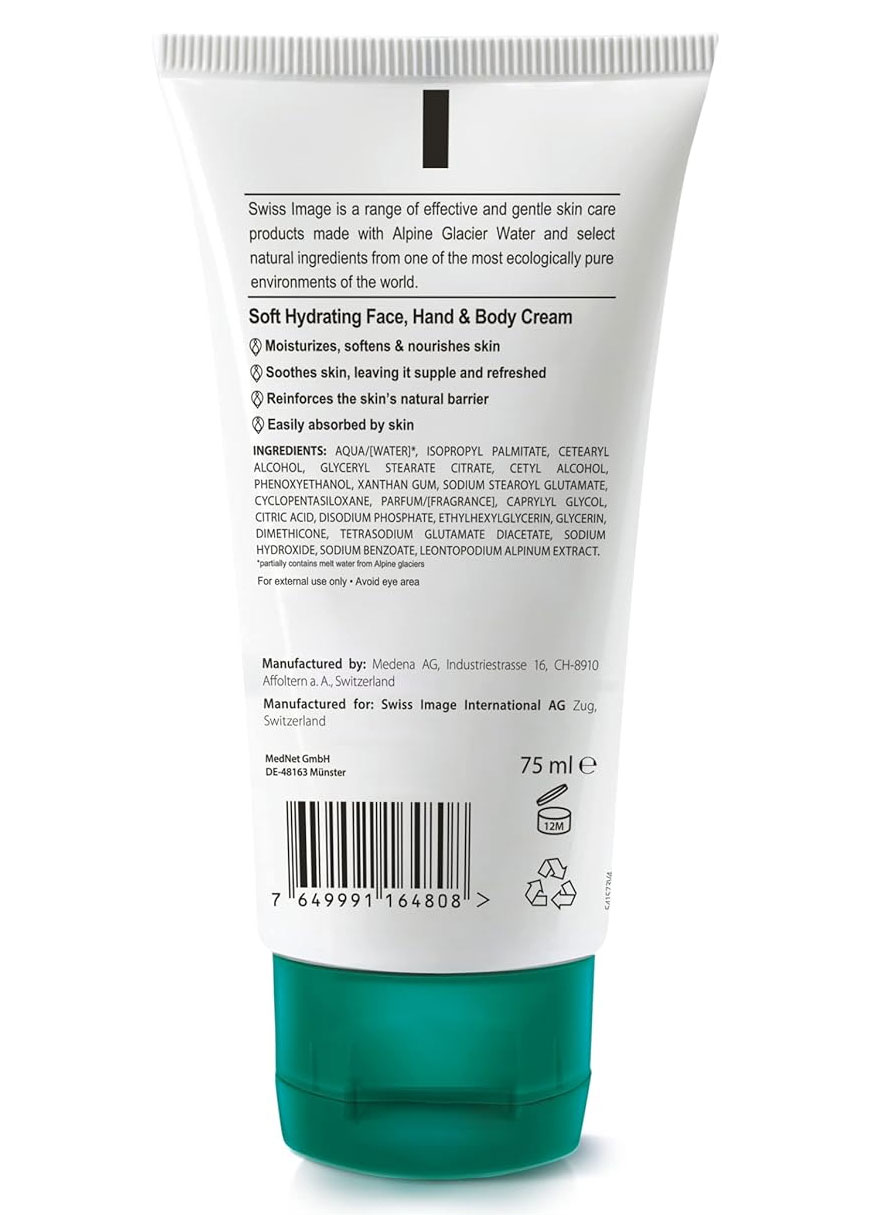 کرم آبرسان صورت و بدن سوئیس ایمیج Swiss Image Soft دارای فرمول غنی شده با آب ذوب شده یخچال های طبیعی کوه های آلپ غنی از مواد معدنی مورد نیاز با خاصیت احیای سرزندگی پوست و کمپلکس گیاهان کوه آلپ (سپیدگوهر آلپ) برای تاثیر ویژه بر روی پوست و محافظت در برابر عوامل محیطی است. کرم آبرسان سوئیس ایمیج با لطافت بخشی و رطوبت رسانی عمیق، پوستی هموار و شاداب را در تمام طول روز به ارمغان می آورد.