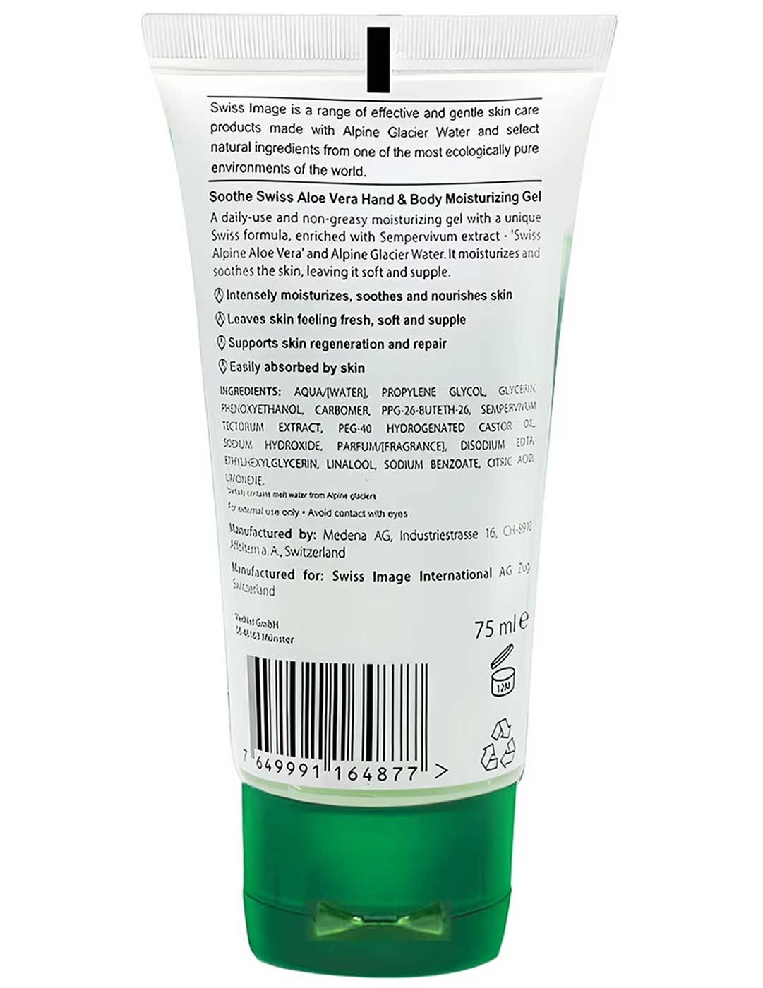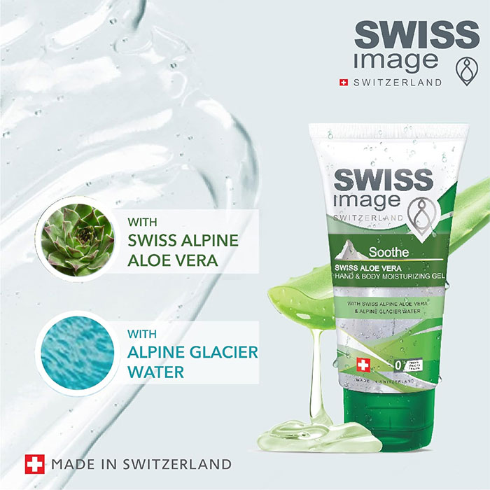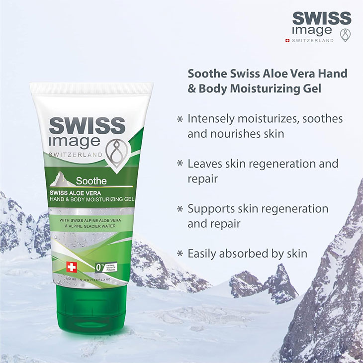ژل تسکین دهنده و آبرسان بدن آلوئه ورای سوئیس ایمیج Swiss Image Soothe دارای فرمول غنی شده با آب ذوب شده یخچال های طبیعی کوه های آلپ غنی از مواد معدنی مورد نیاز با خاصیت احیای سرزندگی پوست و عصاره آلوئه ورای سوئیسی کوه های آلپ با خواص تسکین بخشی و بازسازی کنندگی پوست است. ژل سوئیس ایمیج با ترمیم کنندگی و آبرسانی قوی، پوستی تسکین یافته، تازه و شاداب را به ارمغان می آورد.