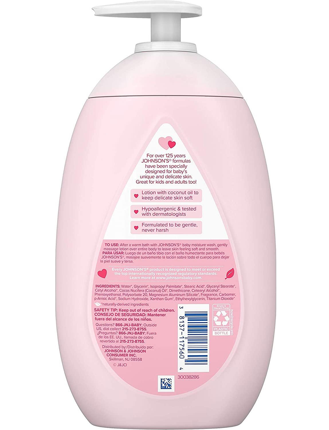 لوسیون بدن کودک جانسون Johnson Baby Lotion حاوی بیش از 98 درصد عصاره های طبیعی برای رطوبت رسانی 24 ساعت پوست ظریف و حساس کودک و محافظت روزانه پوست می باشد. لوسیون کودک جانسون حاوی گلیسیرین برای افزایش ماندگاری رطوبت در بافت اپیدرم و روغن نارگیل برای تغذیه، حفظ لطافت و مراقبت پوست است. این ترکیب کاملا ملایم بر روی پوست و دارای pH متعادل و غیرآلرژی زا است و برای جلوگیری از خشکی پوست کودک و رطوبت رسانی پوست حساس سایر اعضای خانواده گزینه ای ایده آل محسوب می شود.