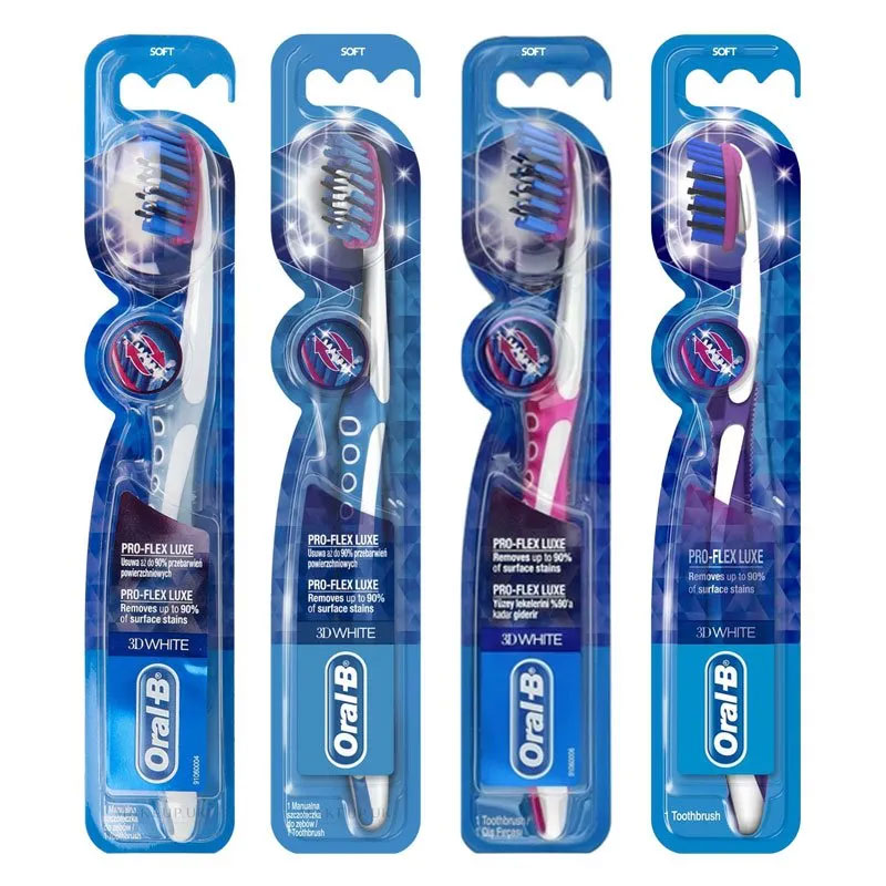 مسواک نرم و سفیدکننده اورال بی تری دی وایت Oral B 3D White Luxe دارای طراحی نوآورانه با سر دوگانه با قابلیت خم شونده برای پاک کنندگی منحصر به فرد و ایجاد لبخند سفید درخشان می شود. مسواک 3D White Pro-Flex دارای برس با ابتدای قدرتمند برای نفوذ عمیق به فضای میان دندانی و کناره های با انتهای گرد برای ملایمت کامل بر روی لثه است، این طراحی باعث سفیدکنندگی دندان ها در طی 2 هفته استفاده منظم می شود.