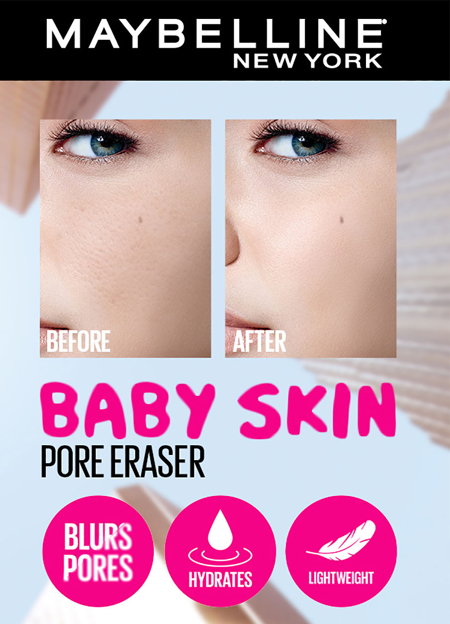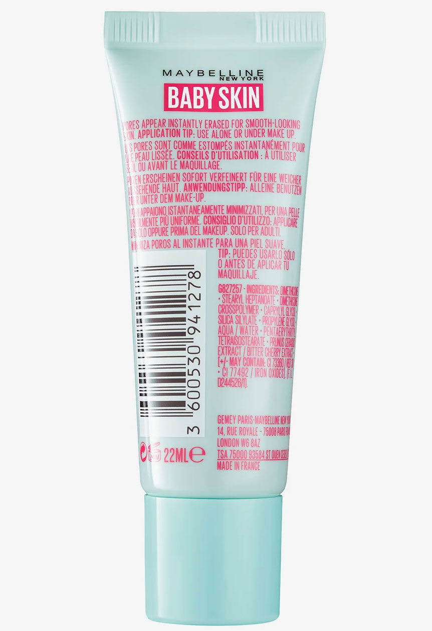 پرایمر محو کننده منافذ میبلین بی بی اسکین Maybelline Baby Skin دارای فرمول ویژه برای پوشش و محو کردن منافذ باز پوست و ایجاد نمای صاف، مخملی و مات مانند پوست نوزاد می باشد. پایه آرایشی میبلین دارای فناوری Insta-Blur برای محو کنندگی فوری و همچنین بافت سبک و رطوبت رسان برای تنفس و آبرسانی پوست زیر آرایش می باشد. این ترکیب علاوه بر این حاوی عصاره گیلاس تلخ برای تغذیه و لطافت پوست است.