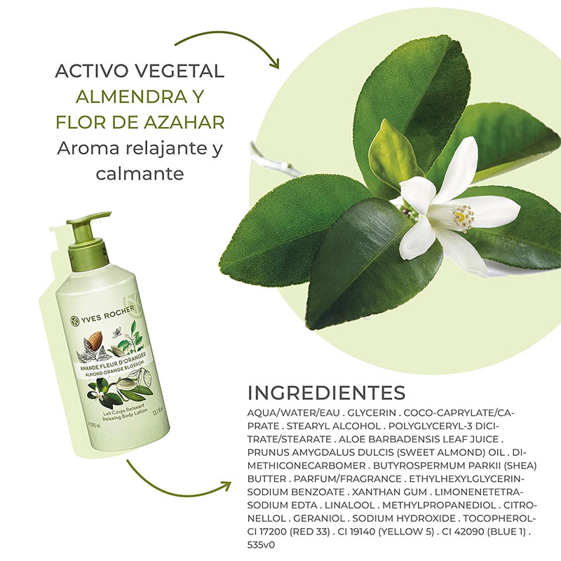 لوسیون بدن بادام و شکوفه پرتقال ایوروشه Yves Rocher Relaxing حاوی بیش از 96 درصد عصاره های طبیعی برای تغذیه و آسودگی پوست و ایجاد پوستی لطیف و خوشبو در تمام طول روز می باشد. لوسیون بدن ایوروشه حاوی شی باتر ارگانیک و بدست آمده از برنامه تجارت عادلانه (از سال 1959) برای تغذیه عمیق پوست و ژل ارگانیک آلوئه ورا برای آبرسانی و حفظ شادابی پوست بدن است. این ترکیب همچنین حاوی عصاره شکوفه پرتقال با رایحه دلپذیر برای لطافت بخشی پوست و روغن بادام برای رفع خشکی و محافظت پوست می باشد.