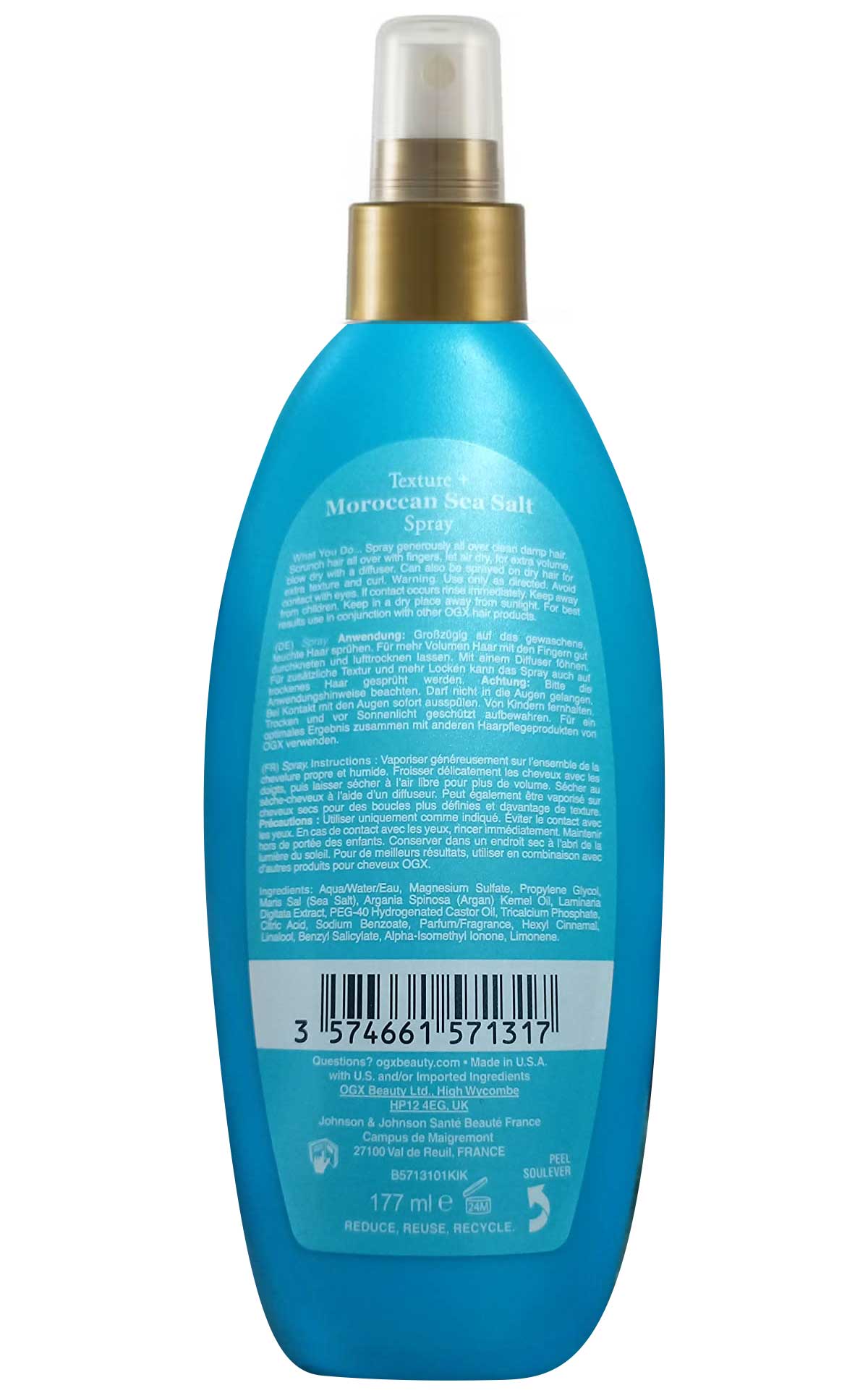 اسپری حالت دهنده موهای ساحلی او جی ایکس Ogx Sea Salt دارای فرمول ویژه برای ایجاد موهای مواج بی نقص و زیبا با ظاهر ساحلی جذاب و کاملا باز شده می باشد. اسپری موی او جی ایکس حاوی روغن آرگان مراکشی برای تغذیه و کنترل انعطاف پذیری موهای رها و نمک دریایی برای حجم دهی و سرزندگی موها می باشد. این ترکیب همچنین حاوی جلبک دریایی کلپ برای تامین مواد ضروری مورد نیاز فیبر مو محافظت از سلامتی انواع بافت مو است.