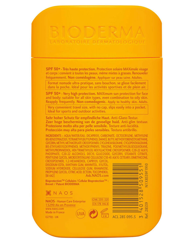 فلویید ضدآفتاب بایودرما فتودرم مکس Bioderma Photoderm SPf50 دارای فناوی پیشرفته سلولار بایوپروتکشن ثبت اختراع شده توسط بایودرما جهت محافظت قدرتمند پوست در برابر پرتوهای UVA و UVB با فیلترهای اس پی اف بالای 50 می باشد. فلویید ضدآفتاب بایودرما حاوی بافت سبک، بدون چربی، مقاوم در برابر آب و رطوبت و بدون رایحه است و با جذب آسان، سریع و بدون احساس چسبندگی، نمای لطیف و یکدستی روی پوست ایجاد می کند. این فرمول برای انواع پوست از جمله پوست های مختلط، چرب و حساس مناسب است.