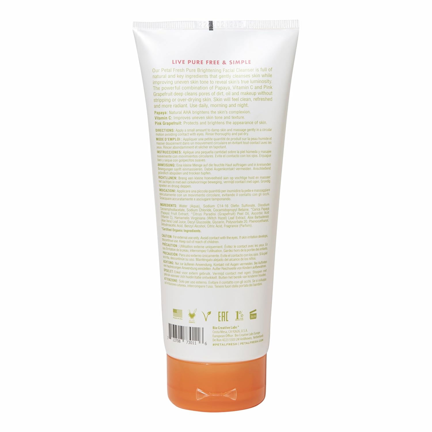 Water (Aqua), Sodium C14-16 Olefin Sulfonate, Disodium Cocoamphodiacetate, Sodium Chloride, Cocamidopropyl Betaine, *Carica Papaya (Papaya) Fruit Extract, *Citrus Paradisi (Grapefruit) Peel Oil, Ascorbic (Vitamin C), Hamamelis Virginiana (Witch Hazel) Leaf Extract, Aloe Barbadensis (Aloe Vera) Leaf Juice, Decyl Glucoside, Glycerin, Polysorbate 20, Phenoxyethanol Dehydroacetic Acid, Benzyl Alcohol, Citric Acid, Fragrance (Parfum). *Certified Organic Ingredients
