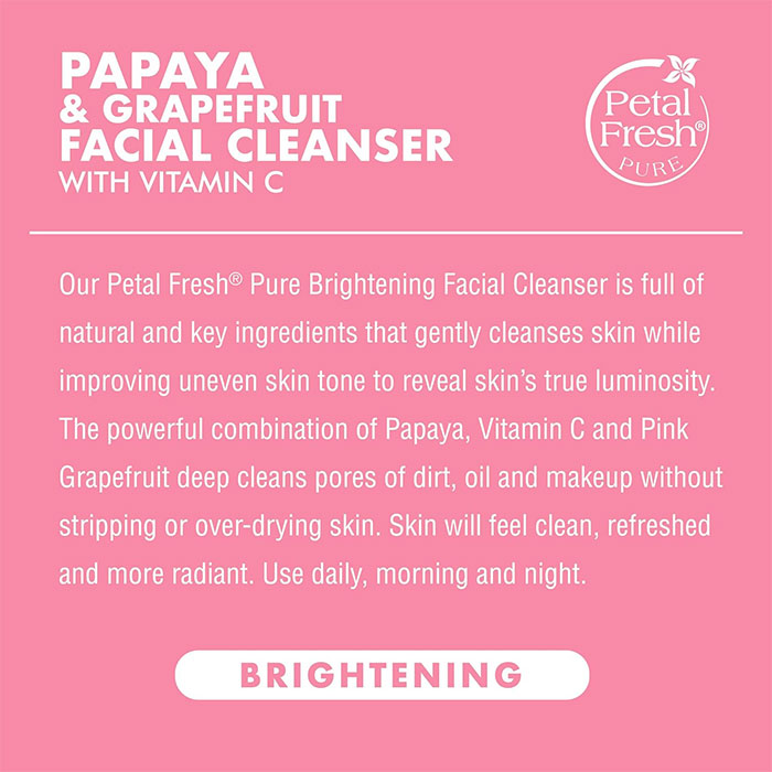 ژل شوینده و روشن کننده پاپایای پتال فرش Petal Fresh Papaya دارای فرمول باکیفیت و حاوی عصاره های کاملا طبیعی برای پاک کنندگی ملایم آلودگی ها، چربی اضافی و آرایش صورت به همراه روشن کنندگی و بهبود ظاهر یکنواخت و شفاف پوست می باشد. شوینده صورت پتال فرش حاوی عصاره پاپایا غنی از آلفا هیدروکسی اسید طبیعی برای روشن کنندگی پوست، ویتامین سی برای بهبود ظاهر یکدست پوست و عصاره گریپ فروت صورتی برای محافظت و روشن کنندگی پوست است، در نتیجه پوستی تمیز، شفاف و روشن تر خواهیم داشت.