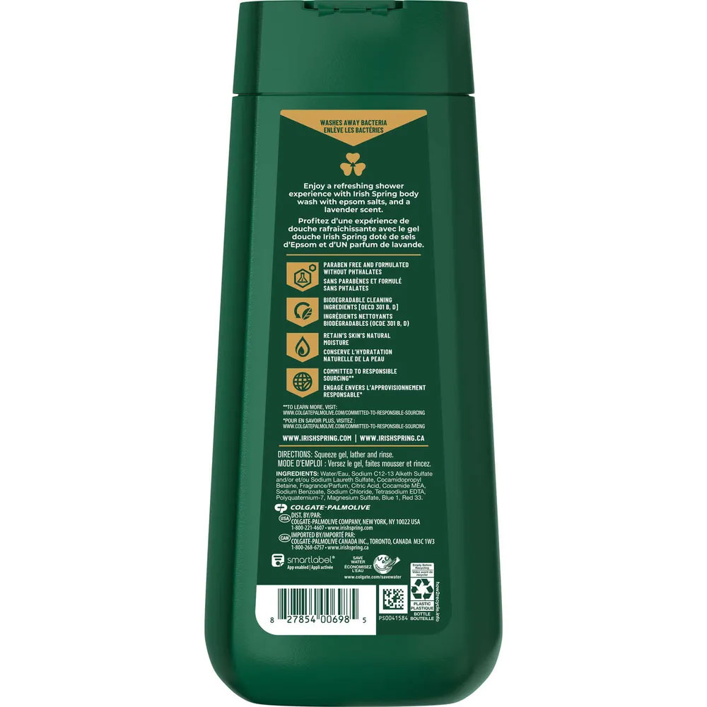 شامپو بدن شاداب کننده ایریش اسپرینگ Irish Refresh دارای فرمول جدید برای رطوبت رسانی، پاک کنندگی، آرامش بخشی و حس خوشبوی طولانی مدت بدن در تمام طول روز می باشد. شامپو بدن ایریش اسپرینگ حاوی عصاره لاوندر با خواص آرامش بخشی و رایحه آسوده کننده است، این ترکیب همچنین حاوی نمک اپسوم برای احیای مجدد عضلات خسته و دردناک و رفع استرس و آرامش بخشی بدن و ذهن است. نمک اپسوم از نام روستایی در انگلستان گرفته شده که در سال 1618 برای اولین بار مزرعه داری متوجه خواص شگفت انگیز آن در سلامتی پوست و ترمیم خراش و زخم شد. نمک اپسوم حاوی منیزیوم سولفات معدنی است که تنظیم کننده بیش از 300 آنزیم بدن است و نقش آرامش بخشی عضلات را بر عهده دارد.