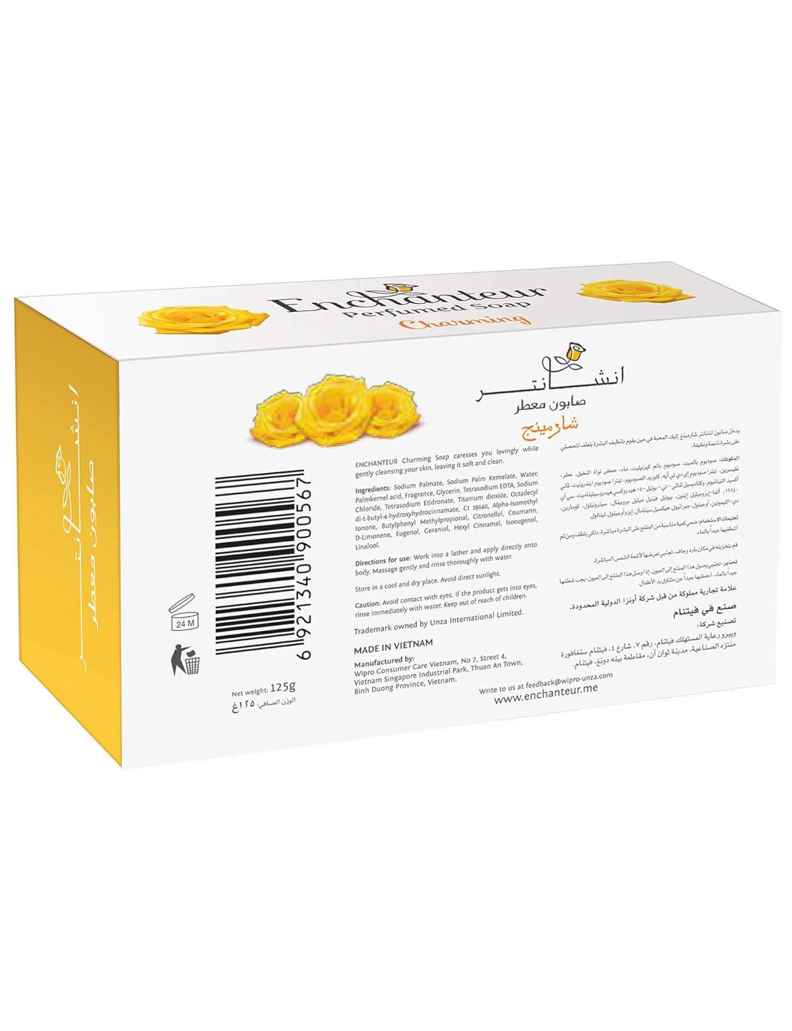 صابون معطر انچانتر چارمینگ Enchanteur Charming دارای رایحه دلپذیر گلی به همراه پاک کنندگی ملایم برای ایجاد پوستی تمیز و خوشبو در طول روز می باشد. صابون چارمینگ حاوی رایحه گل رز، گل زنبق دره و چوب صندل است، این ترکیب کاملا بر روی پوست ملایم است و با حفظ رطوبت پوست باعث آرامش جسم و ذهن می شود.