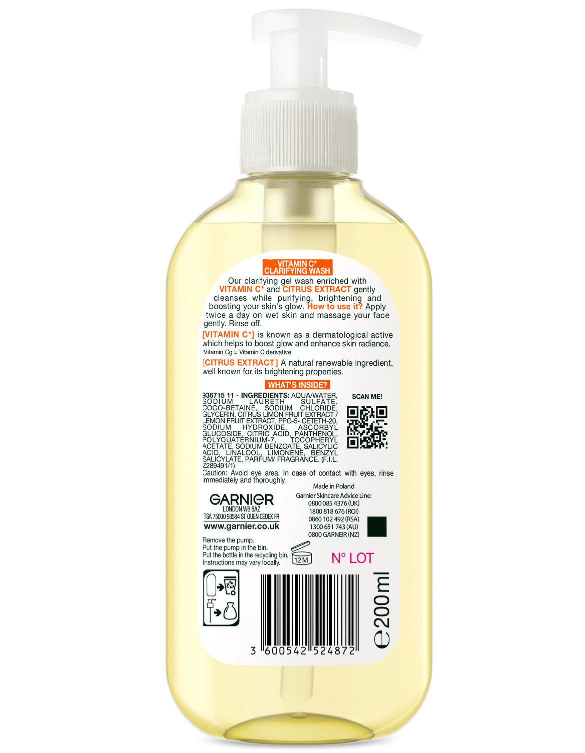 ژل شوینده و روشن کننده ویتامین سی گارنیه Garnier Vitamin C Clarifying دارای فرمول ملایم بر روی پوست برای پاک کردن آلودگی ها و آرایش و حاوی ویتامین سی برای افزایش شفافیت، درخشندگی و روشنایی پوست و عصاره مرکبات برای نوسازی و روشن کنندگی پوست می باشد. ژل شوینده گارنیه همچنین حاوی پنتنول (پرو ویتامین B5) برای ترمیم و بازسازی پوست و سالیسیلیک اسید برای تصفیه منافذ و خاصیت ضدجوش است و پوستی تمیز و شفاف تر را به ارمغان می آورد.