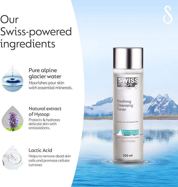 تونر تسکین دهنده سوئیس ایمیج Swiss Image Soothing دارای فرمول حاوی عصاره های طبیعی باکیفیت بدست آمده از طبیعت کوه های آلپ سوئیس برای پاک کنندگی بقایای آلودگی و آرایش پس از شستشو و تسکین بخشی پوست های نرمال و خشک می باشد. تونر سوئیس ایمیج حاوی عصاره گیاه زوفا با خواص آنتی باکتریال و آنتی اکسیدانی، آب یخچال های قطبی کوه های آلپ غنی از مواد معدنی برای متعادل سازی و شادابی فوری صورت و لاکتیک اسید برای نوسازی و کاهش منافذ باز پوست است و پوستی تسکین یافته و باطراوت را حاصل می شود.