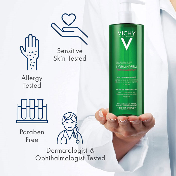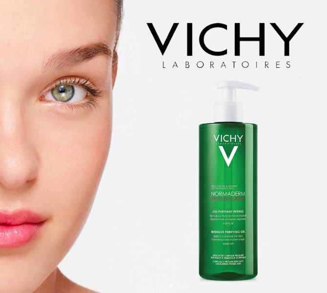 ژل شوینده صورت ویشی نرمادرم Vichy Normaderm دارای فرمول باکیفیت غنی شده با مواد معدنی و پروبیوتیک برای پاک کنندگی عمیق آلودگی و چربی اضافی سبوم پوست های چرب و حساس با حفظ تعادل پوست و بدون ایجاد خشکی می باشد. ژل شوینده ویشی حاوی کنستانتره 0.5 درصد سالیسیلیک اسید با خواص آنتی باکتریال برای پاکسازی منافذ پوست و رفع جوش های سرسیاه است. این فرمول همچنین حاوی زینک اکساید با خواص ضد التهاب برای تصفیه، هموار سازی و تمیزی کامل پوست های چرب و مستعد جوش و مس برای پاک کردن سلول های مرده می باشد. علاوه بر این باکتری های پروبیوتیک بیفیدو برای استحکام بخشی و تقویت سد محافظت طبیعی پوست به منظور متعادل سازی و جلوگیری از ترشح چربی اضافی پوست به این ترکیب اضافه شده است.