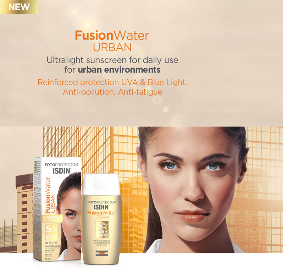 ضدآفتاب بی رنگ محیط شهری ایزدین فیوژن واتر Isdin Fusion Water Urban SPF30 دارای فرمول ویژه برای محافظت از پوست در محیط شهری توسط عملکرد چندگانه ضد پرتوی UVA و UVB و حفاظت در برابر پرتوی آبی منتشر شونده از وسایل الکترونیکی می باشد. این ضدآفتاب همچنین مانند سپر حفاظت نامرئی از پوست در برابر آلودگی محیط شهری محافظت می کنند و دارای عملکرد ضد خستگی است.