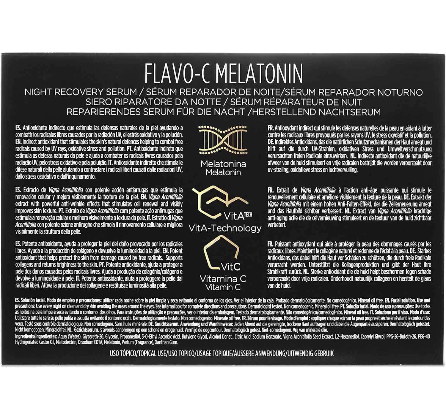 سرم بازسازی کننده شب ایزدین Isdin Flavo-C Melatonin دارای فرمول انحصاری با اثربخشی در طول شب و زمان استراحت برای تقویت سد محافظت آنتی اکسیدانی پوست و آماده سازی صورت برای مقابله با اکسیداسیون و استرس های محیطی رخ دهنده در طول روز می باشد. سرم فلاوو سی ایزدین حاوی ملاتونین به عنوان یک آنتی اکسیدان غیر مستقیم است که با نفوذ به پوست به DNA دسترسی پیدا می کند و فرایند تولید آنزیم های آنتی اکسیدانی را در طول شب سرعت می بخشد، این آنزیم ها مسئول مقابله با استرس هایی هستند که در روز بعد رخ خواهد داد، در نتیجه صبح روز بعد پوستی بازسازی شده و درخشان خواهیم داشت. این ترکیب همچنین حاوی عصاره طبیعی بکوچیول سرشار از رتینول با خواص ضدپیری برای افزایش سفتی و انعطاف پذیری پوست و همچنین ویتامین سی برای روشن کنندگی و مقابله عوامل استرس زا و اکسیداسیون می باشد.